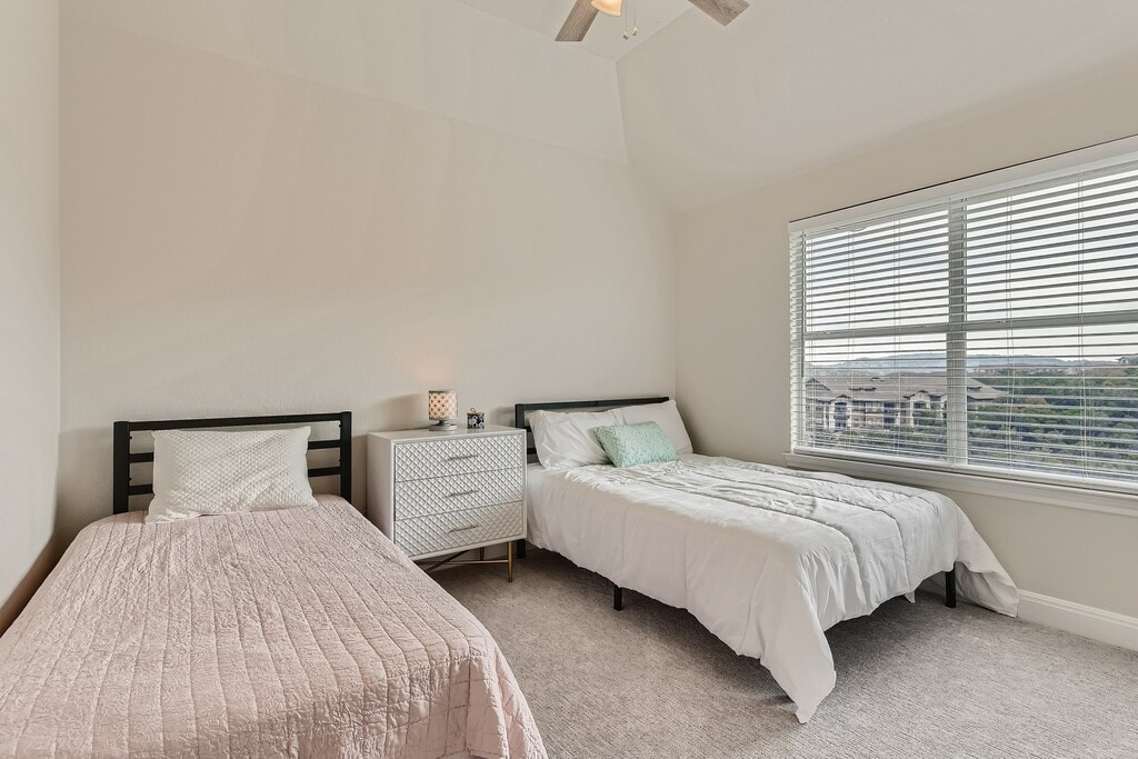 Stunning fully furnished 3-story condo with panoramic hill country views nestled in a lovely gated community. The inviting open floor plan features soaring ceilings. Modern fixtures and ample sunlight add to the airy feeling. Calming hill country views abound through large windows. The updated kitchen boasts granite countertop, recessed lighting, and generous storage space. Upstairs you’ll find a bonus living area and two bedrooms. The primary bedroom on the main level offers a spacious private balcony and luxurious en suite bath with soaking tub and shower combo. The lower level features a private suite with ample storage and direct access to the spacious back patio that could be used as a 4th bedroom. Enjoy a turn-key lifestyle with all landscaping maintained by HOA. 2 car garage. Dedicated laundry room with washer and dryer included on the main level. Spectacular Ridge at Alta Vista community amenities includes an Olympic-sized swimming pool, tennis courts, fitness center, and playscape. Prime location across the street from Lake Travis High School, 5 minutes from the Hill Country Galleria, with lots of shops and restaurants nearby.