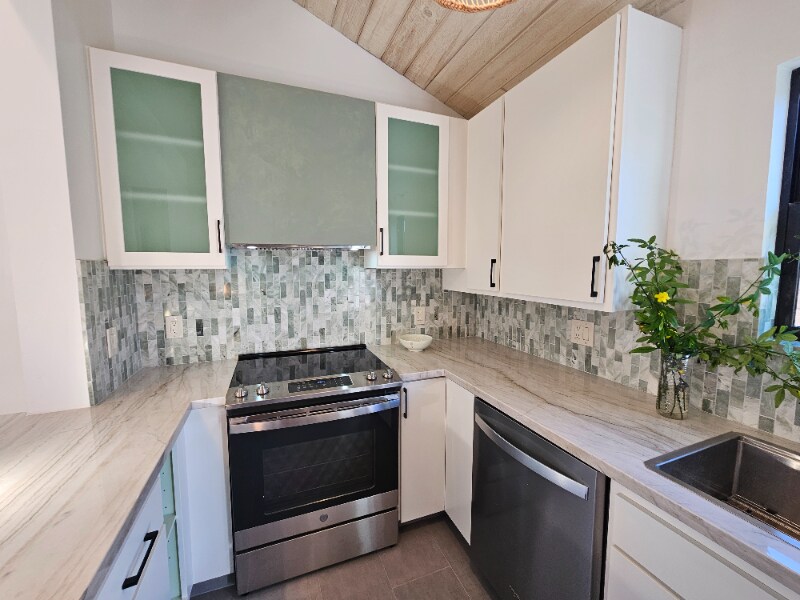 Property Id: 1409411 It has been remodeled inside and out, new exterior plaster, black clerestory windows, 200 amp electrical, modern drywall texture, paint and floors. Living room: hardwood floors, vaulted ceiling, modern staircase with wire rails. Kitchen: quartzite counters, a green marble backsplash, green glass cabinets, sage hood vent, white modern cabinets, tile floors and woven wood chandeliers. New stainless steel appliances: stove, hood vent, dishwasher, built-in microwave and side by side refrigerator. Bath: vaulted wood ceiling, carrara marble vanity, carrara tile bath & shower, and a separate water closet. Master suite is a private retreat: small bath and a wall of windows that frame a peak at the ocean. The 2 downstairs bedrooms have vaulted wood ceilings and oak flooring. The garage is a modern bonus room, glass roll up, 40 amp plug, Laundry room: lots of storage, a double sink and built-in ironing board. Fenced backyard, storage shed, 2 decks & a little greenhouse. Sorry NO DOGS.
