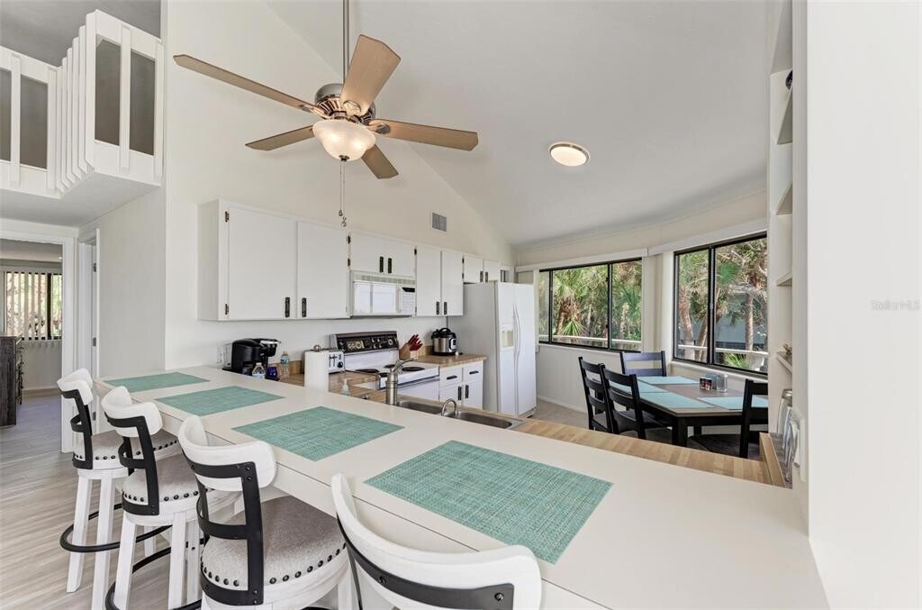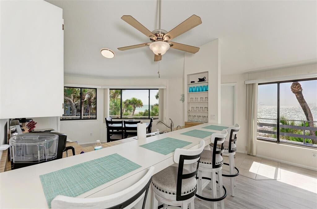 A secluded & private,nearly one-acre tropical paradise surrounds this beachfront coastal-style home. A spectacular property with its own private beach! Unsurpassed Gulf Views will take your breath away! As you enter,you gaze across the spacious and open floor plan,through the windows that open onto the wrap-around expansive deck,and out to the stunning views of the beautiful beach and sparkling Gulf. You notice how the sunlight pours in,fills the home with light,and lifts your spirits. Soaring high ceilings,tile floors in the kitchen area,and an incredible amount of cabinets,closets,and storage in this home. This home is spacious with 2 Bedrooms,2 Bathrooms. There is currently a queen sofa bed in the living room. Plus a great loft area for additional guest space You will never want to leave when you watch in awe the spectacular nightly performance,sunsets on the gulf! There are so many spaces that beckon you to enjoy time with family and friends as you blissfully watch the ospreys soar,the pelicans dive,and manatees and dolphins playing in the shimmering sea. The yard is true serenity for a nature enthusiast and beckons you to meander through the island-style lush & park-like grounds with many Oak and Palm trees. The unique shape of this home will give you breathtaking views of Southwest Florida sunsets. You will never miss a sunset as the never-ending panoramic views of the Gulf of Mexico are available to you from inside the home,outside around your property,and on the beach. This home is tucked back from the road and the mature landscape offers added privacy. And just steps away through your private backyard,you step out to your private beach where you can relax and sink into the sand with a frosty beverage in your hand. This is a desirable and unique location walking or biking distance to a park with playground,beautiful trails through mangrove forests,and additional public fishing docks,pavilion & picnic areas. MLS# A4545498