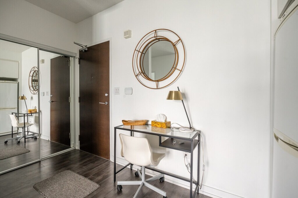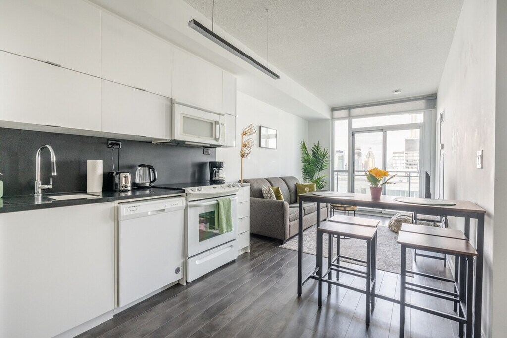 Feel at home in this cozy unit with a balcony, located in the heart of the downtown entertainment district on a high floor. Paid underground parking with in/out privileges is available upon request for $20 per night ($10 CAD if you book parking for 28 nights or more). A travel crib (for babies 0-18 months) and bed rails are available for $5 per item per night. Pets are allowed with a fee of $10 per pet per night. Please confirm availability for pets, the crib, and bed rails prior to booking. Enjoy easy access to the TTC, Union Station, Lake Shore, and Gardiner Expressway. This apartment is steps away from the CN Tower, Rogers Centre, Union Metro Station, Financial District, bars, restaurants, and Sobeys Grocery Store. According to the condo rules, information about all guests must be provided to the condo management prior to arrival, including names, ID details, and vehicle and license plate numbers (if parking is required). Guests whose names or ID do not match the information given are not allowed into the building. Guests must be 18 or over in order to check in. [SI]