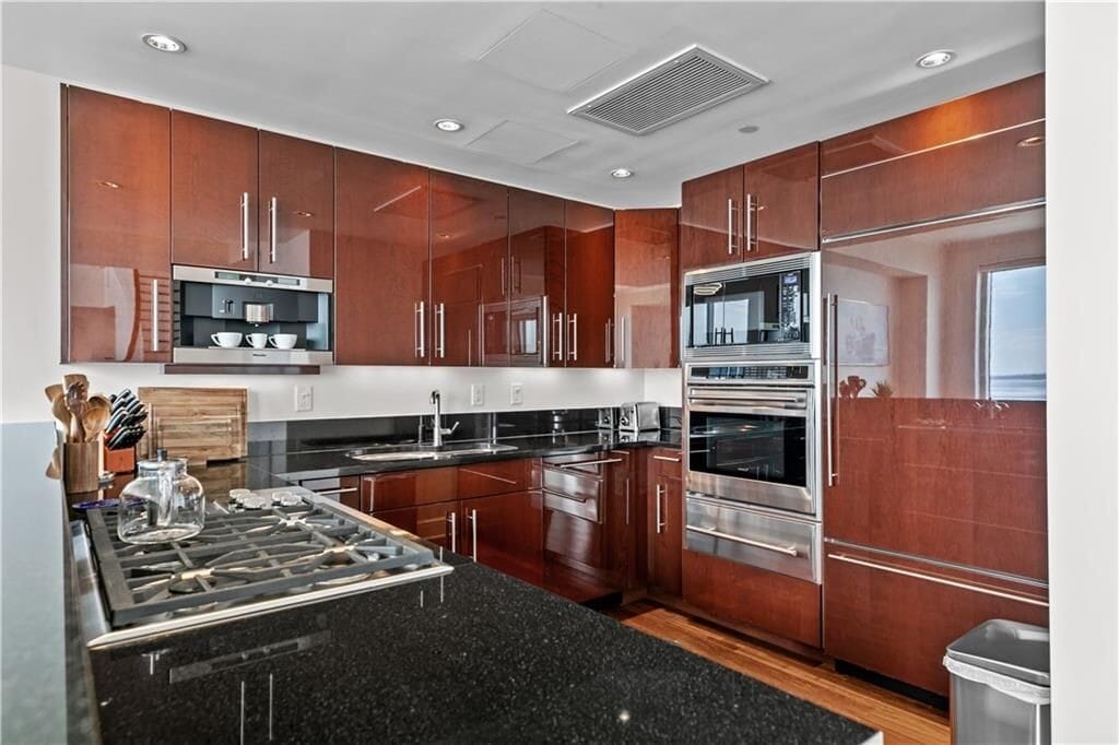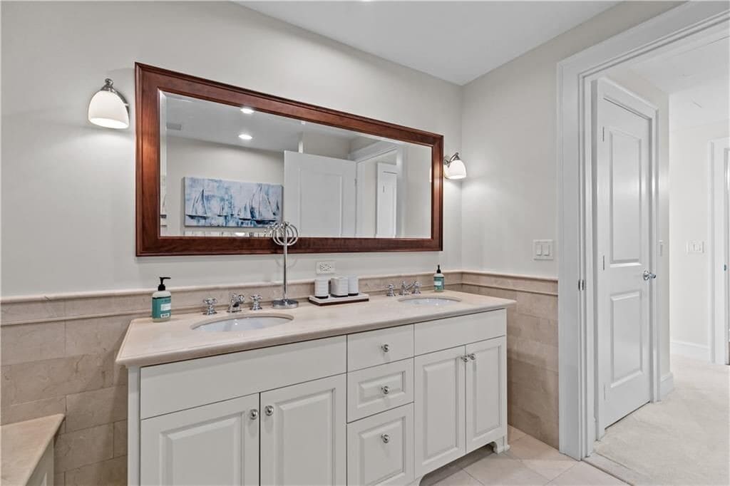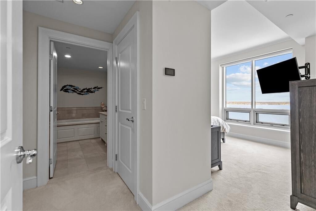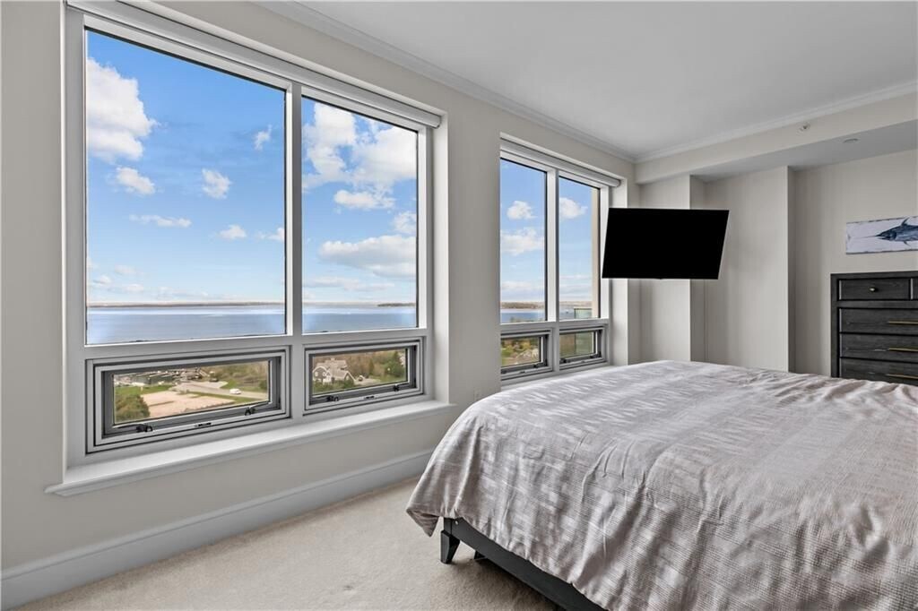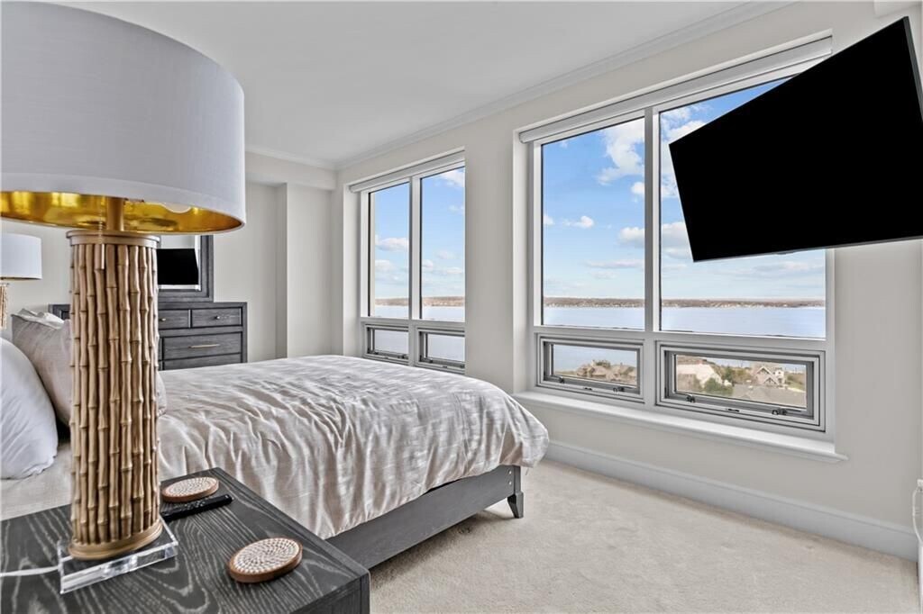 With sweeping views of Prudence Island, the Mount Hope Bridge, and the Newport Bridge, this stunning two-story townhouse-style apartment offers a tranquil retreat on the coast. Thoughtfully designed with comfort and style in mind, this home features a first-floor primary suite, three spacious bedrooms, and three and a half bathrooms. The gourmet kitchen is a culinary dream, boasting ample counter space, high-end Viking and Subzero appliances, and an inviting island with seating for four—ideal for casual meals or entertaining guests. Throughout the apartment, automatic blinds provide effortless control over lighting, allowing you to create the perfect ambiance at any time of day. Step out onto the expansive balcony and be captivated by breathtaking views of Narragansett Bay, stretching from Beavertail to Providence and beyond. Here, you can unwind in the serene atmosphere, soaking in stunning sunsets over the water. This apartment includes two designated parking spaces, one of which is covered for added convenience. Welcome home to your coastal haven, where every detail is designed for relaxation and refined living.