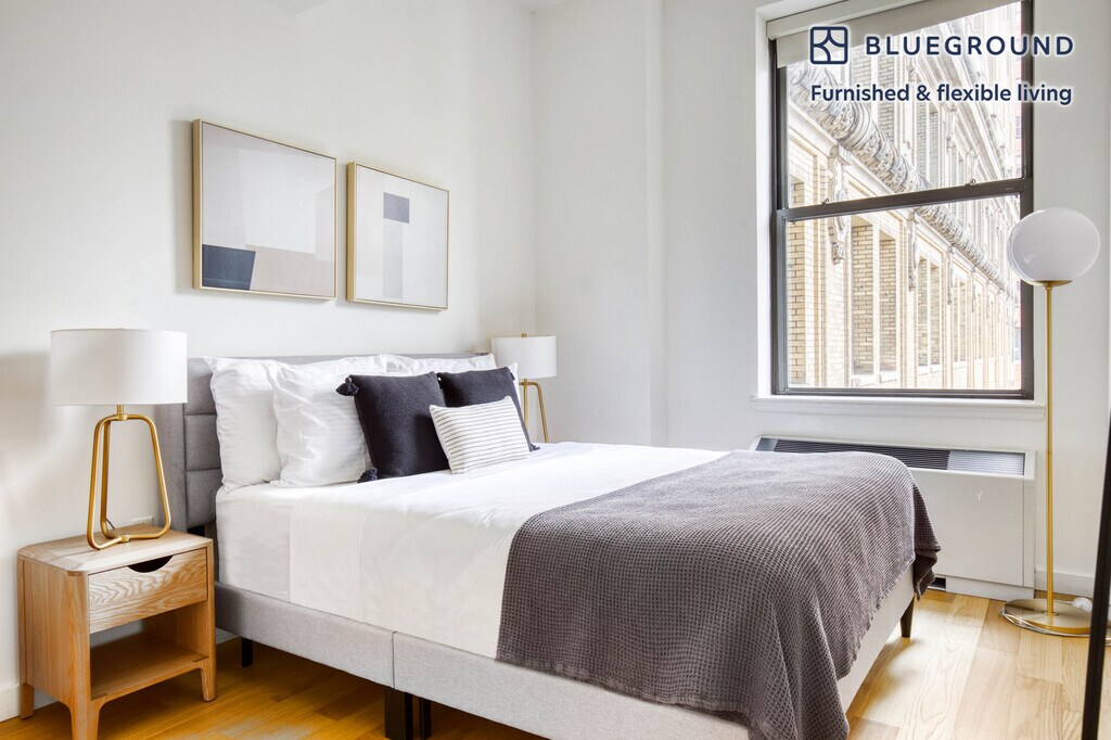 Feel at home wherever you choose to live with Blueground. You’ll love this cozy Financial District furnished one bedroom apartment with its modern decor, fully equipped kitchen, and pretty living room. Ideally located, you’re close to all the best that New York has to offer! (ID #NYC443) The advertised rate of $5,220/month is the lowest available price, based on a 12 month(s) stay with a move-in date of June 7, 2026. Rates vary depending on the duration of stay, season, and other parameters. For exact pricing and additional pricing components, please visit our website and enter your desired move-in and move-out dates. The rate is applicable when billed upfront; it can be higher if billed in multiple payments. Brokers are welcome to reach out. Were you looking for an unfurnished lease? Try Blueground instead and upgrade from unfurnished to furnished living: - Furnished at rates comparable to unfurnished - No setup or furniture costs - save thousands - Move-in ready - save time, just bring your suitcase Designed with you in mind As with any Blueground apartment, you’ll find a thoughtfully designed space complete with beautiful furniture and a fully equipped kitchen in this one bedroom property. And, thanks to our superior quality mattresses, luxury linens, and towels, you can relax knowing you’ll always feel comfortably at home. When you’re ready for some fun, you can take in the New York vibes or bring the entertainment to you with the premium wireless speaker or smart TV. This apartment also offers in-floor laundry. Sleeping arrangements Queen Bed, 63in/160cm Amenities Building amenities unique to this one bedroom apartment include an on-site: - Doorman - Dryer of floor - Elevator - Washing machine on floor - Lounge - Pets allowed Arrival and ongoing support The entire apartment is yours to enjoy! Throughout your stay, you’ll have access to our Client Experience team through the Blueground App. You can schedule additional cleanings, submit maintenance requests, and view our neighborhood recommendations with just a few taps. We’ll share all details upon confirmation of your stay. Ideally Located This furnished apartment is located in the Financial District, also known as FiDi. Home to Wall Street, One World Trade Center, the South Street Seaport, and Bowling Green it is a constant hub of activity. During the week the sidewalk is always bustling and the restaurants are filled with professionals. The glittering skyscrapers and well-known landmarks make this one of the city’s most recognizable and historic neighborhoods. By subway, Times Square is about 20 minutes away. Other things to note Building amenities may have an extra cost. This Blueground apartment has flexible lease options, allowing you to book it for one month, a year, or more. Pets are welcome, though weight limits and breed restrictions apply and may incur fees. Brokes CYOF. We take great pride in ensuring every photo displayed is shot in our own units with our actual furnishings. That said, we regularly refresh our decor and furniture arrangement, which may differ from what’s pictured. Also note - The apartment's building is undergoing renovations, and you may hear construction noise inside your apartment from time to time [SI]