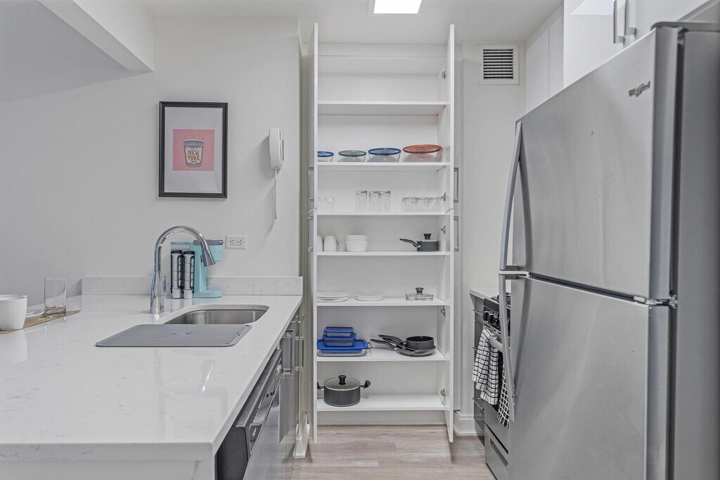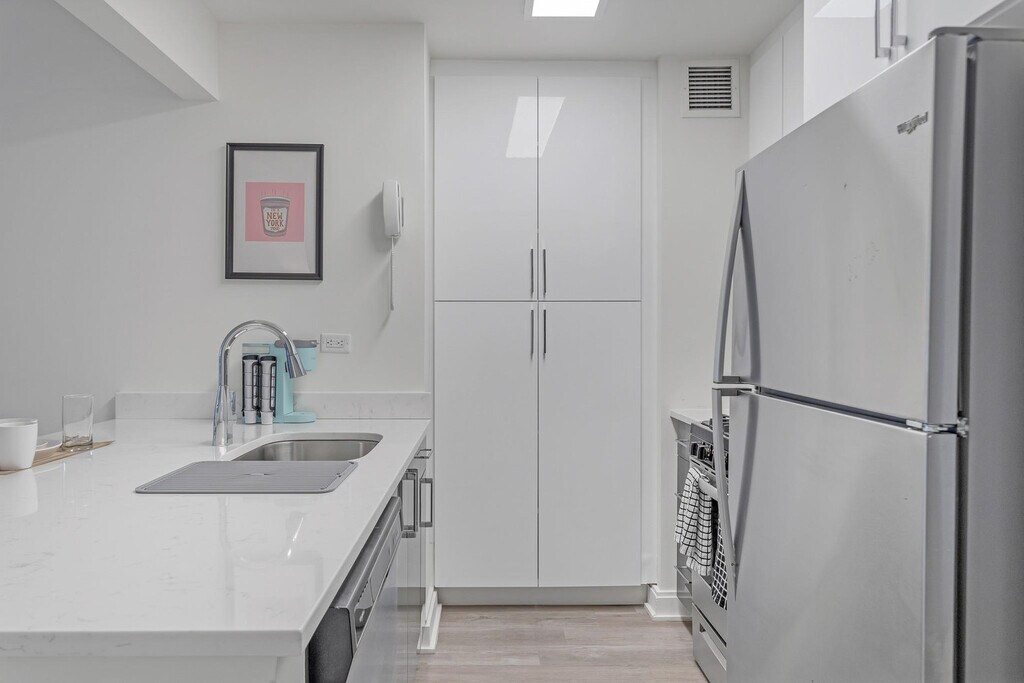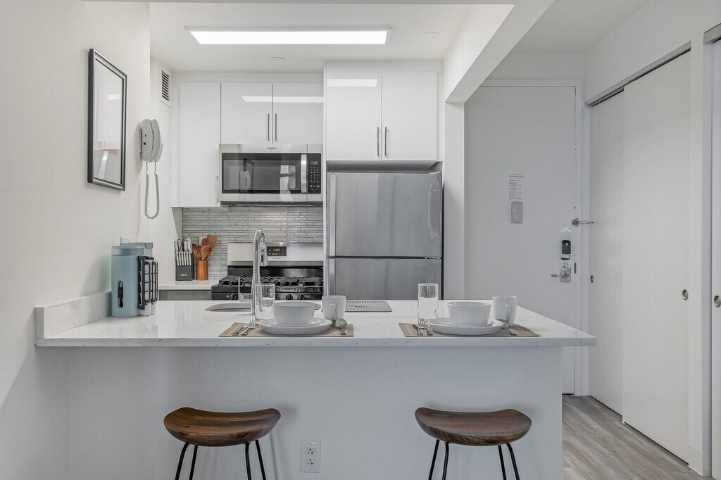 Feel at home in this studio apartment in the heart of New York City’s Financial District, with the action of Wall Street at your doorstep. The elevators are being renovated until Spring 2026. This fully furnished studio is specifically designed for remote workers and professionals and includes a queen-size mattress, full bathroom, fully equipped kitchen with a breakfast bar, smart TV, and all utilities. Amenities include a stocked kitchen with a Keurig coffee machine and pods, stainless steel appliances (including dishwasher), laundry on-site, two sets of elevators, a business center and conference rooms, a resident lounge and bar with pool tables, a rooftop sundeck with city views and BBQ grills, a dry cleaner in the lobby, and a 24-hour door attendant. Special rates are available at the on-site Complete Body Fitness Club. Stroll through Battery Park, enjoy a delicious meal by the Seaport, or indulge in high-end shopping at the Brookfield Mall, all within walking distance of your apartment. It's steps to the Seaport and riverside promenade, a 4-minute walk to Broad St. Station with the J and Z trains, a 3-minute walk to Wall & William St. and the 2 and 3 trains, a 4-minute walk to the NY Ferry Terminal, a 6-minute walk to Bowling Green Station and the 4 and 5 trains, and a 7-minute walk to Battery Park, Whitehall Terminal, and the Staten Island Ferry. There is a 24-hour Duane Reade across the street and a Starbucks next door. Internet speeds are not guaranteed and may fluctuate based on your computer model and the router location. A laptop computer is not included in the home office set-up. There is no parking at this property (off-site parking is available nearby). Includes private high-speed internet, an Uplift standing desk, an Uplift work chair, a 34-inch ultra-wide monitor (Samsung), a microphone (Blue Yeti), a webcam (Logitech), computer speakers (Logitech), a key light, a monitor light, a green screen, a Logitech keyboard, a Logitech mouse, a laptop stand, and a TOTU 16-in-1 Triple Display USB-C 3.1 Docking Station. [SI]