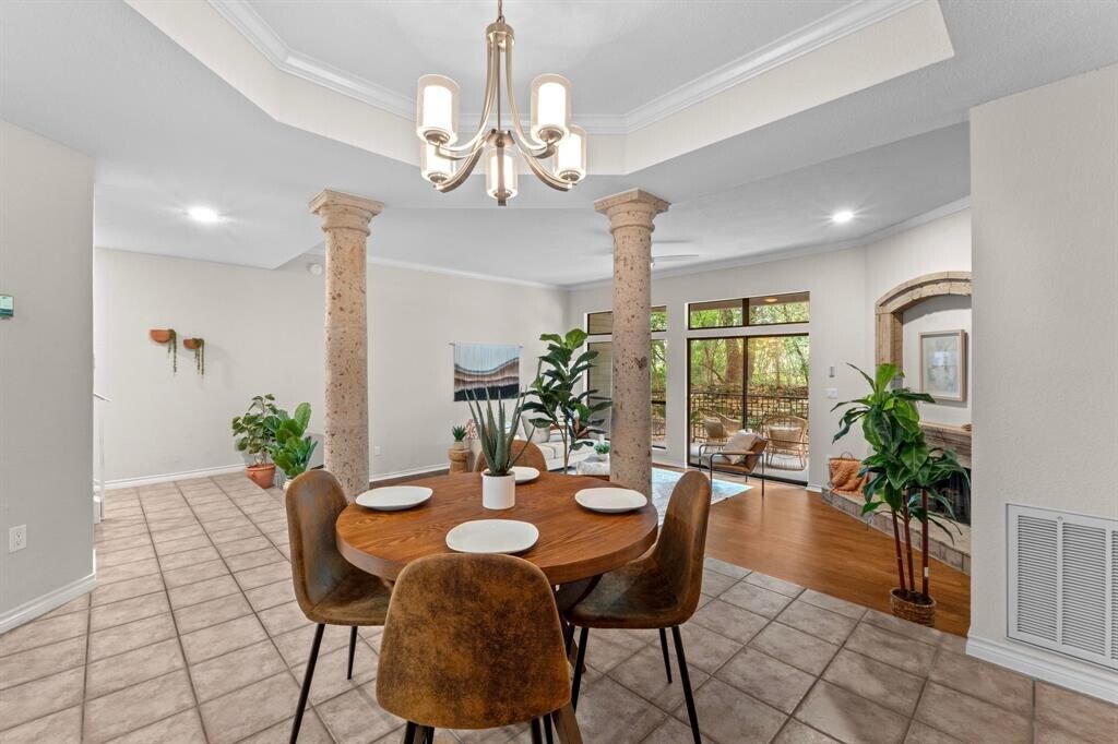 Private secluded beauty awaits! This gorgeous gated 2/2 condo has two suites each with full bath. The primary bedroom has a fireplace and built in shelving. Primary bedroom has private balcony. High ceilings and crown molding add to the charm. A second fireplace is located in family room with high ceilings and gorgeous hardwood floors. The plan is open and inviting for entertaining. The spectacular views of downtown are hard to beat. Condo backs to greenbelt so no neighbor behind you. Washer,dryer, and refrigerator convey for tenant use.