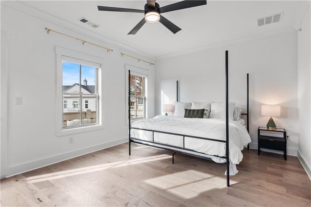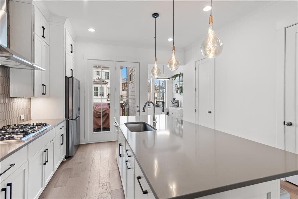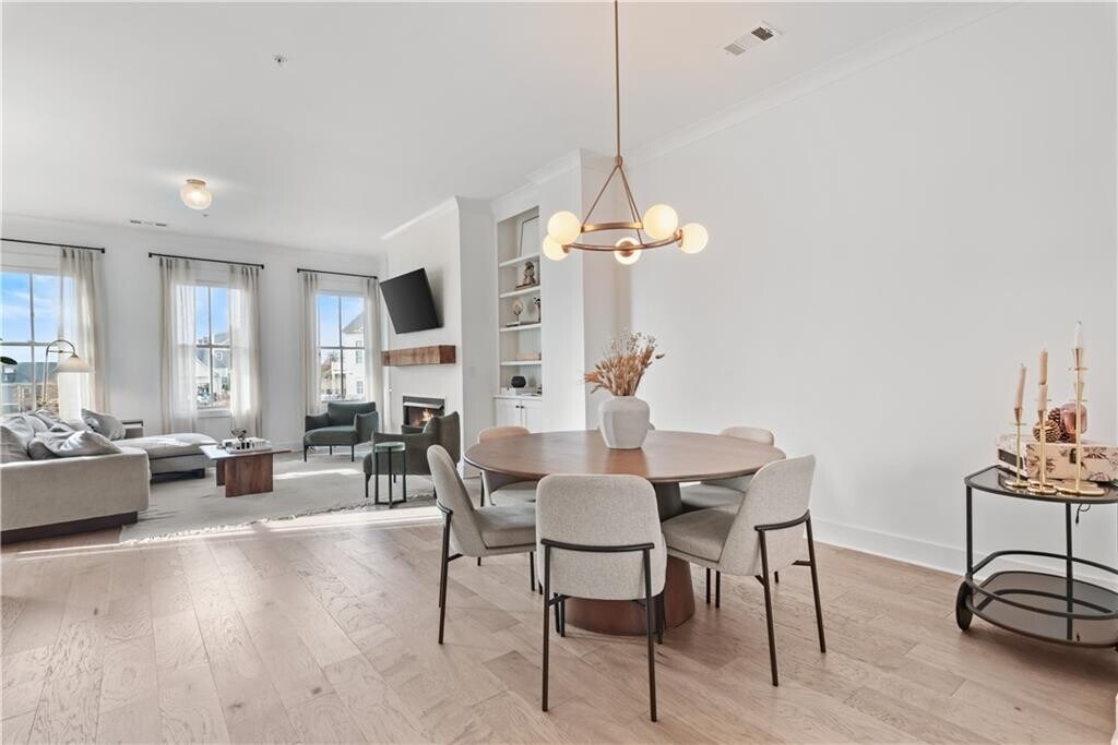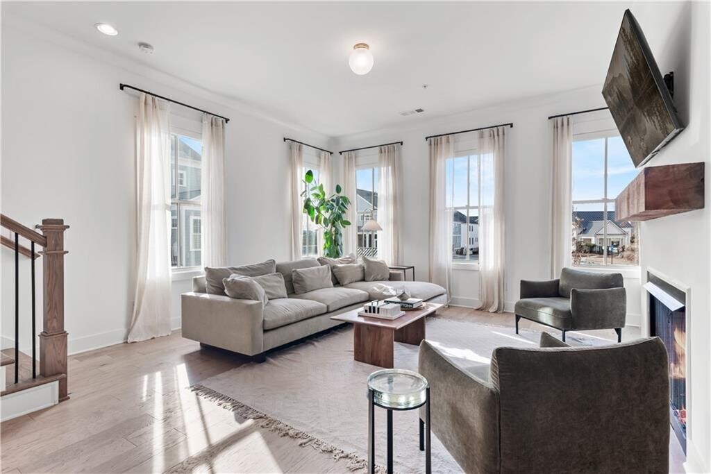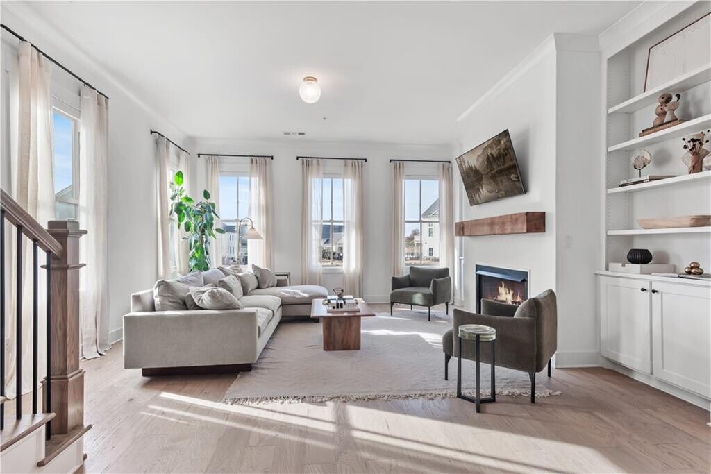 Walk to downtown Woodstock from this exquisitely appointed 3BR/3.5BA townhome located in the coveted South on Main neighborhood. With stunning hardwoods throughout and soaring 10 ft ceilings,this light-filled end unit will exceed your expectations. On the first floor you will find an ensuite bedroom that may be used as living space or office. Prepare to be stunned when you enter the gourmet kitchen with enormous island,quartz countertops,gas cooktop with hood vent,oven/microwave and breakfast area. The kitchen opens into an open concept dining room. Flooded with natural light,the living room boasts enormous windows equipped with remote controlled blinds,a gas fireplace with exposed beam mantel and built-in bookshelves. A deck by the kitchen provides a space for grilling and entertaining. Upstairs,the enormous primary bedroom is a sanctuary equipped with fireplace,custom cabinets and a balcony for enjoying South on Main's iconic sunset views. The primary bath features a spa-like shower,double vanities with quartz countertops and a custom walk-in closet for ample storage. A third bedroom with luxurious full bath has large windows and closet. The laundry room comes equipped with washer/dryer and storage cabinets. Permanent stairs lead to gigantic attic for all of your storage needs. The JW Collection's award winning amenities will keep you entertained! Enjoy the community pool,fitness center,playground,fire pit,grills/picnic area,amphitheater and parks. The neighborhood is attached to the Noonday Creek Trail and features sidewalks throughout. South on Main is conveniently located for walking to downtown Woodstock and for enjoying easy access to I-575/ I-75. Welcome home! MLS ID 7705052