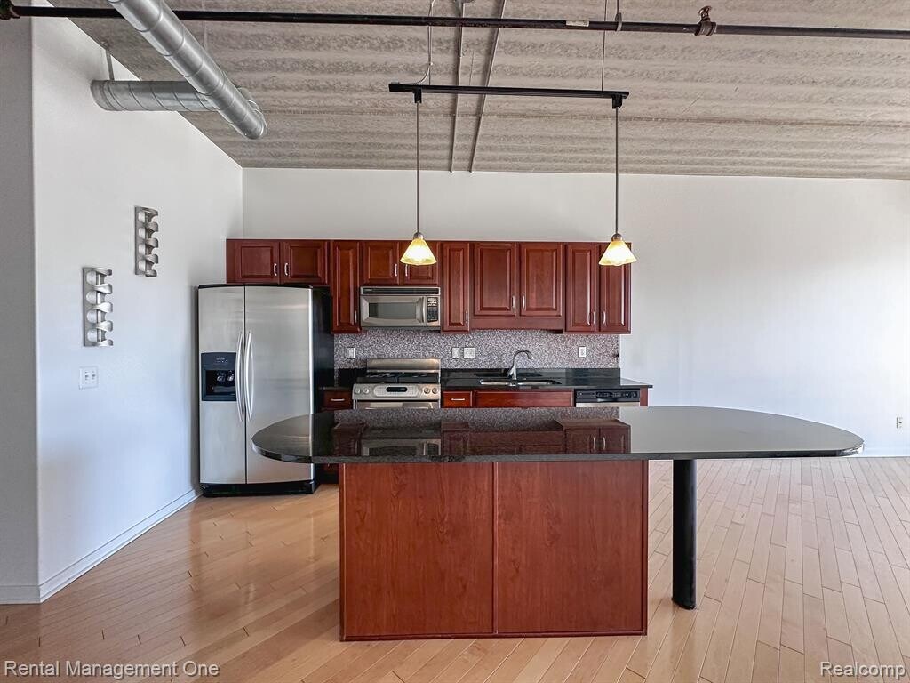 Welcome to luxury living at the Skylofts! Live high above all that Royal Oak has to offer including award-winning restaurants, shopping & entertainment. The sophisticated condo boasts a wide open layout with private balcony, beautiful views of the city, hardwood floors & soaring ceilings throughout. Overlook the city from the sleek kitchen that features white cabinets, granite counters, stainless steel appliances. The spacious living room with gas fireplace provides a perfect space to relax & entertain. Retreat to the primary suite that offers a large walk-in closet & spa-like bath. A 2nd bedroom, nicely appointed 2nd full bath & laundry with in-unit washer & dryer complete this stunning condo. 2 assigned parking spaces. Secured building with lobby, 24-hr fitness center. HOA includes water, gas & building maintenance. Live a lifestyle of luxury & convenience right in the heart of downtown Royal Oak. $300 non-refundable cleaning fee, $200 move in fee, Rent spree application fee$40. 1 1/2 month security deposit, Immediate Occupancy.