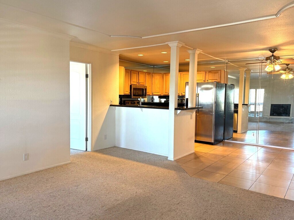 Enjoy the Resort-Style Living of Mission Ridge! Experience the best of convenience and comfort in this beautifully updated single-level condo. The open-concept floor plan features a spacious living room with a cozy fireplace, remodeled kitchen, and dining area that opens to a private balcony perfect for relaxing or entertaining. The primary suite offers generous closet space and additional storage, while the second bedroom and full bath are ideally situated on the opposite side for privacy. In-unit laundry adds everyday convenience. Mission Ridge residents enjoy outstanding amenities including a sparkling pool and spa, fitness center, sauna, tennis courts, racquetball, and beautifully maintained grounds. The community also offers covered parking, an additional assigned space, and guest parking. All these just steps from shopping, dining, and public transit resort-style living with urban convenience!