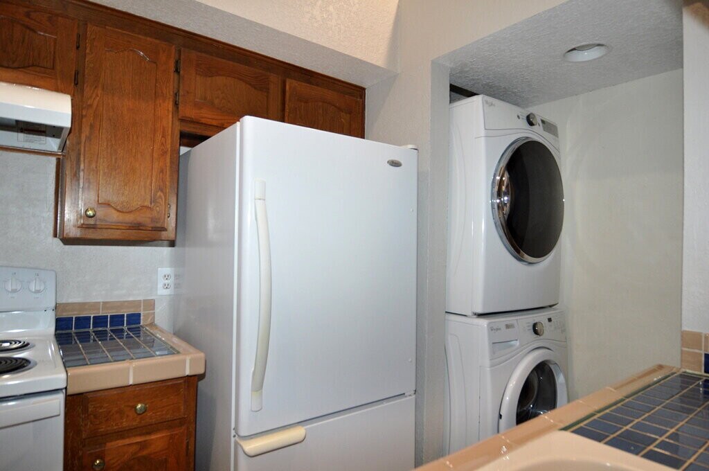 Adorable 2-1 Duplex with Character, Comfort, and Charm! Step into this darling 2-bedroom, 1-bath duplex that offers the perfect mix of warmth, space, and style. The large living area welcomes you with abundant natural light and a cozy fireplace—creating an inviting atmosphere for both relaxing evenings and casual entertaining. The galley kitchen offers everything you need, including a refrigerator, washer, and dryer, with plenty of space to prepare and enjoy meals. Both bedrooms are generously sized, offering flexibility for a guest room, office, or personal retreat. The single bath features a stunning mosaic tile shower that adds a touch of modern elegance. Outside, enjoy your own private courtyard—a peaceful retreat ideal for morning coffee, weekend gatherings, or quiet afternoons with a book. This delightful home is full of character and ready for you to make it your own! *One small pet under 30 lbs considered.