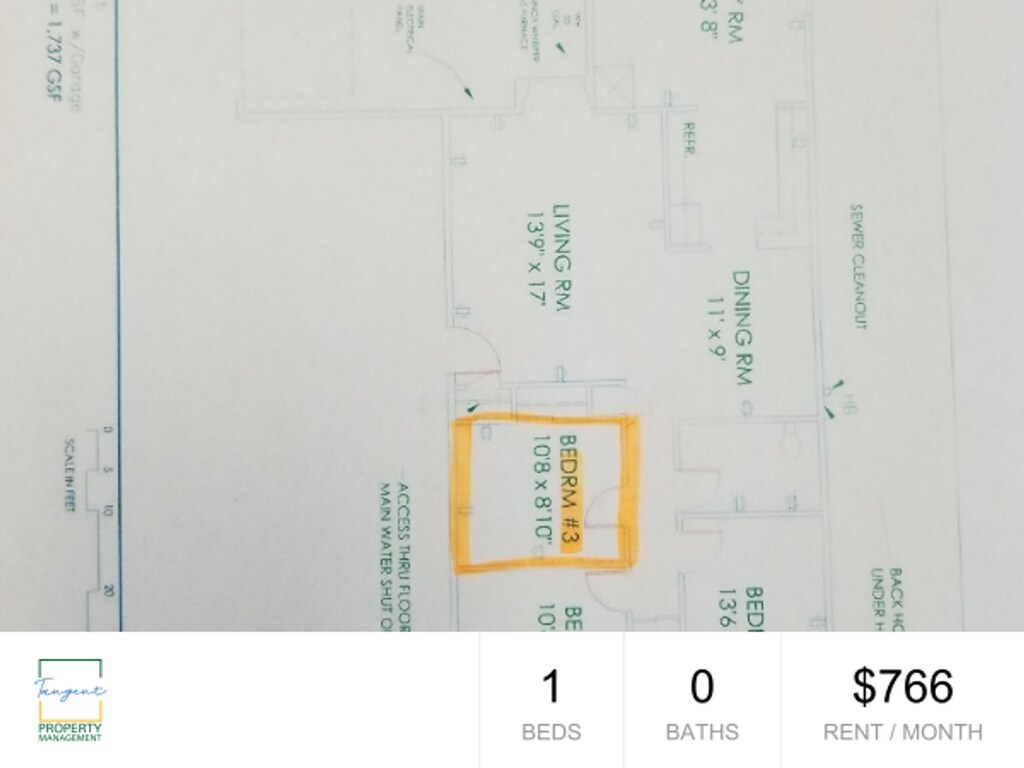 CURRENTLY OCCUPIED Room 3 - This 10’6 x 8’8 room has a closet and shares a full bath with rooms #1 and #2. This single level house has a large living room, a family room, three bedrooms, one and one-half baths, a laundry room, and hardwood floors throughout. The over sized yard is maintained by the College and allows for privacy and quiet. $50/mo utility fee for all utilities except cable/internet. Application Fee is $60.00