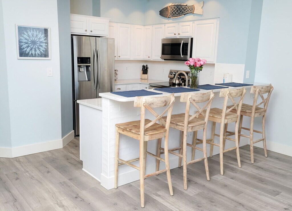 The advertised rate of $9,767/month is the lowest available price, based on a 30 day(s) stay with a move-in date of October 25, 2026. Rates vary depending on the duration of stay, season, and other parameters. For exact pricing and additional pricing components, please visit our website and enter your desired move-in and move-out dates. The rate is applicable when billed upfront; it can be higher if billed in multiple payments. Feel at home in this extraordinary 3-bedroom, 3-bathroom beachside paradise, located on the 4th floor of the Shores of Panama Resort. This apartment offers breathtaking views of the Emerald Coastline, stretching clear to Pier Park. This recently remodeled apartment boasts a sophisticated island vibe with high-end tropical West Indies inspired furnishings. It features soft-close comfort height toilets, two walk-in elegantly tiled showers, and one tub/shower combination. The fully equipped gourmet kitchen is fitted with quartz countertops, bar seating, and all necessary cookware for at-home convenience. Enjoy the private wrap-around balcony, furnished with a Trex dining set, offering spectacular views of the Gulf Coast. The living area includes a new sleeper sofa and a 65-inch Smart Flat Screen Television. The master bedroom has a 55-inch Smart Flat Screen Television and balcony access. The second and third bedrooms also feature Smart Flat Screen Televisions. All bathrooms are equipped with grab bars for safety and convenience. A full-size stainless steel washer and dryer are included, along with free high-speed internet and cable. The resort offers private beach access, a gorgeous lagoon-style Gulf side swimming pool with fountains, two Tiki Bars, a large pool deck with recreational features, a Gulf side hot tub, a large heated indoor swimming pool and hot tub, and a health center with fitness equipment. This 4th-floor apartment includes a premium reserved parking space conveniently located on the same floor, just steps from the unit. The Shores of Panama Resort is a popular destination on Panama City Beach, perfectly situated at the corner of South Thomas Drive and Front Beach Road. Discover several outstanding restaurants and plenty of family-friendly attractions, all within walking distance. Please be aware that Shores of Panama is undergoing exterior construction, which may be loud and disruptive. Construction noise begins at 8:00 am and ends at 5:00 pm. Events, parties, and large gatherings are not allowed, and partying or overcrowding will result in immediate eviction. The maximum occupancy is 8 guests. The registered guest must occupy the apartment and be 25 years of age or older; any reservation found occupying the apartment without a 25+ adult present will be evicted. For reservations made within 48 hours prior to arrival, a government-issued ID and a credit or debit card under the same name as the ID will be required upon check-in. Panama City Beach Ordinance 1667 requires all occupants to be 21 years of age or older, unless a family with children. All occupants over 18 will be required to submit a government-issued ID at the time of booking, and the trusted partner is legally required to keep these IDs on file for inspection and obtain the names and ages of all occupants. This ordinance is in effect for High Impact Periods (March 1 – Memorial Day) and other dates as determined by the city. Guests under 18 must be accompanied by a parent or adult guardian while on property after 10:00 pm (including parking garages, pool decks, walkways, elevators, and beach access points) and during curfew hours of 8:00 pm to 5:00 am inside city limits. No more than 2 minors can accompany 1 parent or adult guardian, and violation of the ordinance can result in fines and eviction. The apartment requires the registered guest booking and occupying the apartment to be 25 years of age or older, with no exceptions. Violation of this policy will result in reservation cancellation and eviction without refund. Pets are not allowed. A mandatory fee of $115 for 2 permits and 8 wristbands is required for resort access. A desk is available in the master bedroom, providing a convenient set-up for remote work. Registration Number: 42636 [SI]