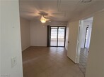 This 2 bed 2 bath house is in the HOA community The Villas at River Run. It is very open concept with a kitchen that has a refrigerator,range,and microwave for appliances. Stackable washer and dryer are there as well. There is a very nice sized screened lanai on the back of the house with access to it from both bedrooms and living room. There is a community pool. Owner will pay for the water and electric utilities. Grass is mowed as well.