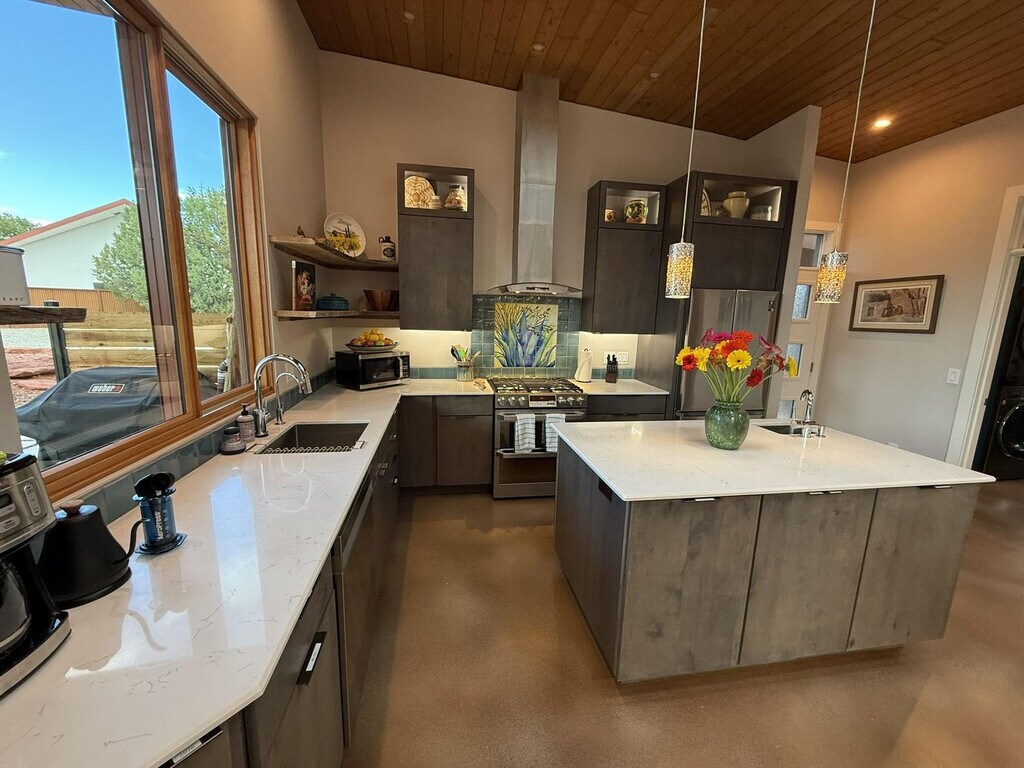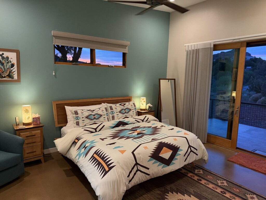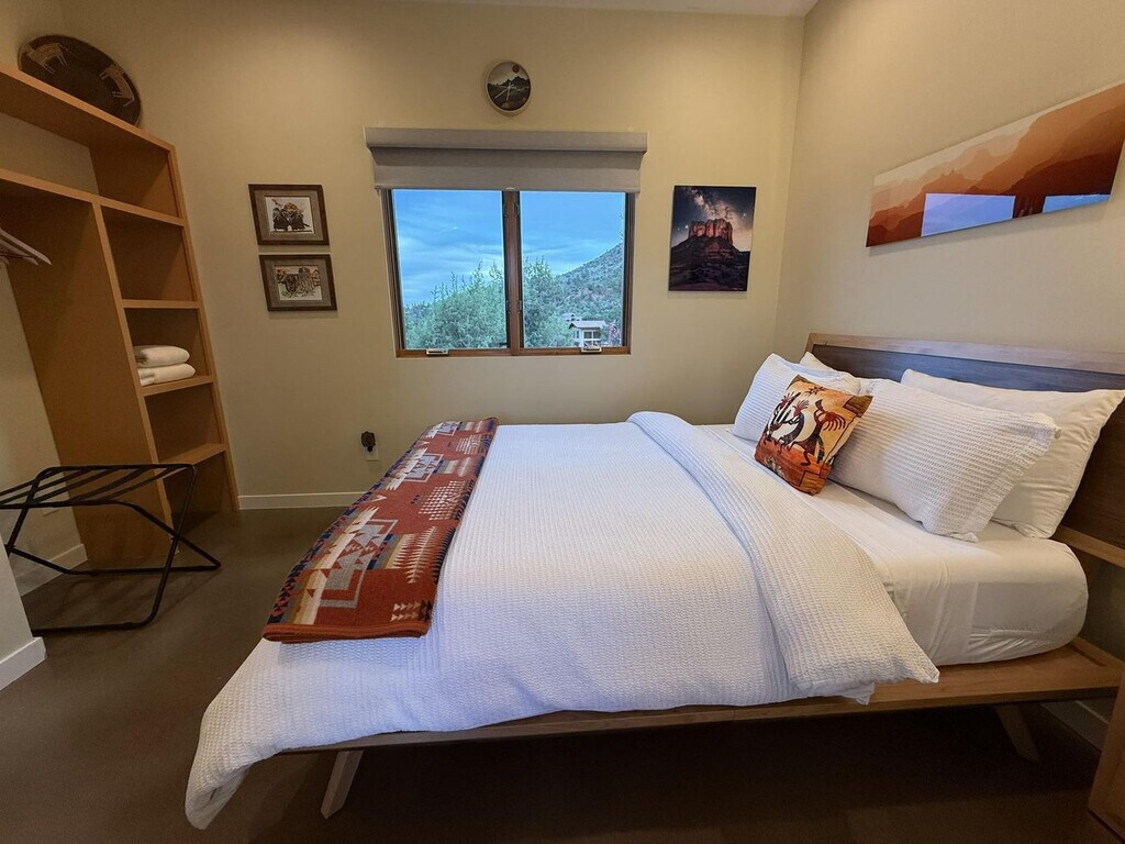 Feel at home in this meticulously curated 1-bedroom casita in Red Canyon, built in 2020 and offering 400 sq ft of comfortable living space. Every detail has been intentionally selected, from custom finishes and hand-built shelving to southwest-inspired pieces. The kitchenette includes a microwave, toaster oven, 4-cup drip coffee maker, tea kettle, medium-size fridge with freezer, and cookware and dinnerware for two. The bathroom features 10-foot ceilings, a walk-in glass panel shower, a single vanity, a hair dryer, an iron and ironing board, plus an in-unit washer and dryer. Amenities provided at arrival include toilet paper, facial tissue, paper towels, dish soap, sponge, laundry detergent pods, fabric softener sheets, Lather luxury bath products (shampoo, conditioner, body wash, lotion), and large and small trash bags. Entertainment is provided by a 65" internet-ready TV (streaming only) and a Bluetooth speaker. Guests can easily control the indoor temperature with the central air conditioning system. Enjoy the outdoor patio with a wood-burning clay chiminea and the complimentary Red Rock Pass. Located in Rancho Rojo Estates, a quiet neighborhood in the Village of Oak Creek, the area is ideal for stargazing and evening walks. The Collective (dining and shops, Tesla and Rivian Charging Stations) is a 2-minute drive or 10-minute walk away. Clark’s Market is 1.5 miles away, and Sedona Golf Resort & Oakcreek Country Club are a 7-minute drive away. Hiking and biking trails nearby include Bell Rock Pathway (1.5 mi), Slim Shady Trail (1.4 mi), Transept Trailhead (2.1 mi), and Baldwin Trailhead (4.5 mi). Smoking and pets are not allowed. [SI]