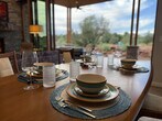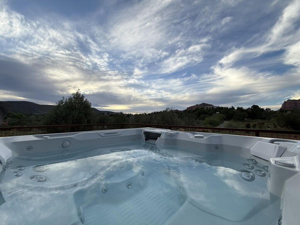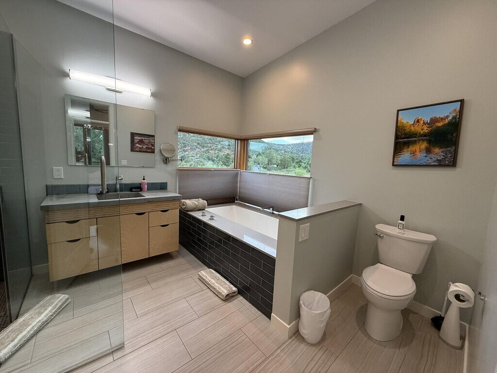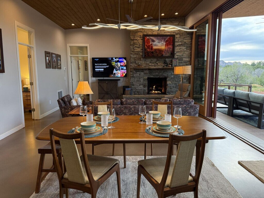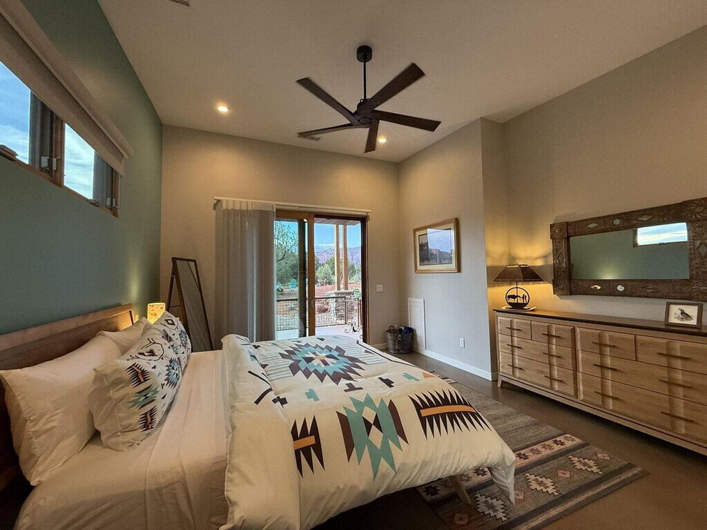 Feel at home in Rancho Rojo, a refined desert retreat in one of Sedona’s most peaceful enclaves. This property features 3 bedrooms and 2.5 bathrooms, and it sleeps 6. The main house has 2 bedrooms and 1.5 bathrooms, while the casita has 1 bedroom and 1 bathroom. This property blends luxury with serenity, offering space to unwind, reconnect, and enjoy Sedona. Natural light pours through large windows, highlighting modern yet inviting living spaces. Curl up by the gas fireplace or gather in the fully equipped kitchen to share a meal with views of Bell Rock. The detached private casita offers its own entrance and full bathroom. Step outdoors and you’ll find expansive patios with shaded seating and a hot tub. This home is stocked with essentials, including toilet paper, paper towels, laundry supplies, bath products, and fresh linens. A dog bed is available for guests with pets. Enjoy the fully equipped modern kitchen, propane barbecue, central air conditioning, and a full-size washer and dryer. The whole house has a domestic water filter, plus reverse osmosis drinking water. The casita has a Brita filter for drinking water. Starlink Wi-Fi is available for streaming or remote work. Ample parking is available for oversized vehicles, trailers, or toy haulers. A Red Rock Pass is available for trailhead parking. Rancho Rojo is located in the Village of Oak Creek, a private neighborhood known for its peace, space, and incredible night skies. It’s perfect for stargazing and evening walks, while still being just minutes from dining, shopping, and golf. The Collective (restaurants, shops, Tesla & Rivian chargers) is a 2-minute drive or 10-minute walk away. Clark’s Market is 1.5 miles away, and Sedona Golf Resort & Oakcreek Country Club are a 7-minute drive away. Bell Rock Pathway is 1.5 miles away, Slim Shady Trail is 1.4 miles away, Transept Trailhead is 2.1 miles away, and Baldwin Trailhead is 4.5 miles away. Pets are considered and must be disclosed at booking; a pet fee and waiver are required. [SI]