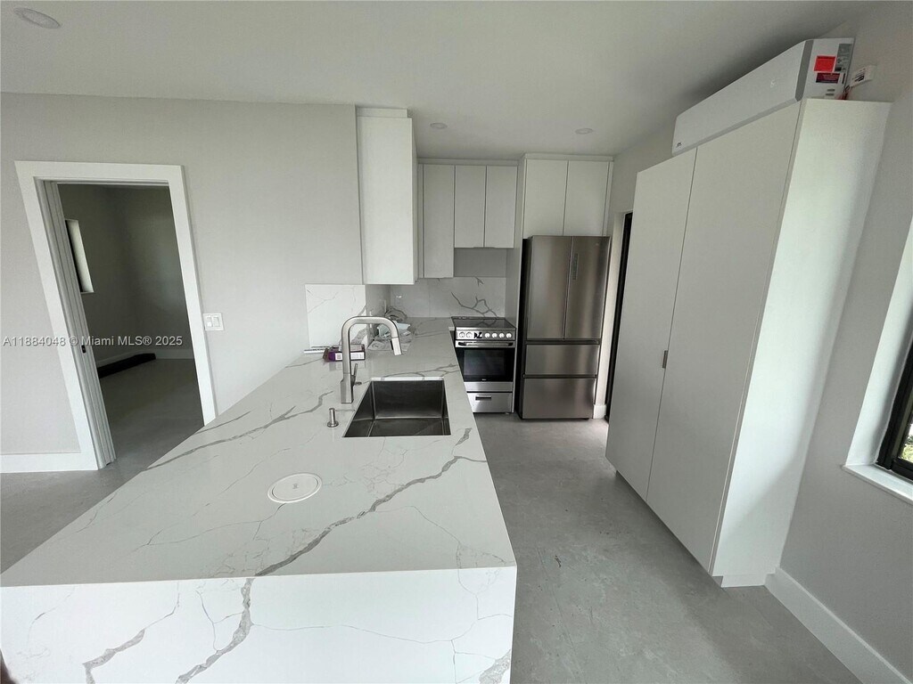 Fully renovated 1 bed 1 bath unit with ~600 sq ft of living space, plenty of lighting from large windows, plus a private rear gated patio to enjoy. This unit has updated kitchen with quartz countertops with waterfall/electrical pop up outlets, garbage disposal, stainless steel appliances, new bathroom, impact windows/doors, new roof, washer/dryer in unit and central AC. This unit will be available end of October 2025. Don't miss out on this as it will rent quickly.
