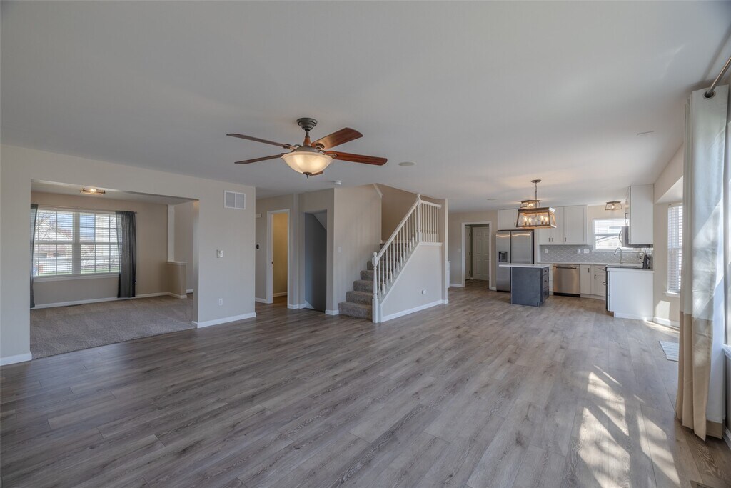 Welcome home. This warm and inviting two-story offers ample space, comfort, and thoughtful updates throughout. With four bedrooms, two full bathrooms, two half bathrooms, and a fully finished lower level this well-maintained home provides the perfect layout for everyday living and entertaining. Step inside the bright two-story foyer, where large windows fill the home with natural light and an electric shade provides privacy when needed. The main level features new laminate flooring (2025) and a comfortable flow between the family room and dining room, creating an ideal setting for gatherings with family and friends. A cozy gas fireplace anchors the living space. The beautifully remodeled kitchen (2025) is truly the heart of the home. Designed with both style and function in mind, it features new cabinetry with soft-close doors and drawers, quartz countertops, a large single-bowl sink, designer backsplash, and new appliances including a refrigerator and dishwasher. Convenience continues with a main-floor laundry room and a custom storage closet to keep everything organized. All appliances are included. Upstairs, the large primary suite is thoughtfully positioned on the opposite side of the home from the other three bedrooms, creating a sense of privacy and separation for owners. The spacious ensuite bath includes a relaxing soaking tub and separate shower. Three additional bedrooms provide plenty of space for family or guests. The fully finished basement expands the living area with laminate flooring, a large entertainment space, TV area, and a full bar complete with sink and refrigerator. Two additional finished rooms offer flexibility for a home office, workout room, or playroom. The pool table, bar fridge, and couch are included, making this level ready for game nights and entertaining. Step outside to enjoy a fantastic backyard ready for play. The huge deck has been recently stained and offers plenty of room for outdoor dining and gatherings. The large umbrella stays. Mature landscaping, newly added trees, and perennial flowers provide beautiful color throughout the summer months. All landscape beds were freshly mulched in 2026, and the former garden area has been reseeded with fast-growing grass for a lush lawn this season. An irrigation system keeps the yard and landscaping green all summer long. The large shed is perfect for storage or yard tools. This home has been lovingly maintained and extensively updated, including fresh paint (2026), a new kitchen (2025), HVAC system with UV light (2025), water heater (2025), smoke detectors (2025), laminate flooring (2025), garage door opener (2024), roof and gutters (2022), radon mitigation system (2022), sump pump with battery backup (2020), lighting (2020), and much more. Ideally located, the home is walkable to Prairie View Elementary School, with convenient access to nearby shopping, dining, and several fantastic city and county parks just minutes away. Lease terms available for interested parties.