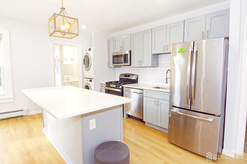 Welcome to 1076 Fulton St- a beautifully renovated 4-bedroom, 2-bath duplex in a prime Rahway location. Step into a modern, thoughtfully designed home featuring an open eat-in kitchen with brand-new custom cabinetry, stainless steel appliances, and sleek quartz countertops. The entire apartment is finished with luxury vinyl plank flooring, adding both style and durability. The second floor offers a spacious living room, modern full bathroom, and a versatile fourth bedroom that can also serve as a home office or playroom. The third floor includes three well-sized bedrooms, each with its own closet, plus an additional full modern bathroom. A dedicated laundry closet adds everyday convenience. Enjoy 1 off-street parking space and access to an enclosed backyard, perfect for outdoor relaxation. Tenants are responsible for heat, hot water, cooking gas, and electric. Unbeatable location close to the Rahway Train Station, shopping, restaurants, parks, and major highways ideal for commuters and anyone seeking convenience.