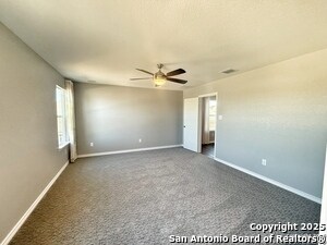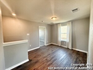Stunning two-story home in the highly desirable Legend Point subdivision! This beautifully maintained property features numerous upgrades and fantastic curb appeal, highlighted by its charming covered front porch. Step inside to a warm and welcoming entryway offering a convenient half bath, coat closet, and direct access to the two-car garage. The spacious living/dining combo is filled with natural light from multiple windows and includes an electric fireplace-perfect for cozy evenings. The open layout creates an ideal environment for both daily living and entertaining. The kitchen-perfect for cooking and hosting-offers a breakfast bar, granite countertops, stainless steel appliances, and a walk-in pantry. Upstairs, a versatile loft provides the perfect office or flex space and thoughtfully separates the primary suite from the secondary bedrooms, laundry room, and second full bath. Both secondary bedrooms are generously sized with excellent closet space. The shared bathroom features a single vanity with an extended countertop, offering great functionality and extra room, along with a tub/shower combo. The spacious primary bedroom features a ceiling fan and an en-suite bathroom equipped with double vanities, a walk-in shower, separate garden tub, private toilet room, and walk-in closet with built-in shelving. Outside, enjoy a peaceful backyard with no rear neighbors and a patio slab ideal for morning coffee or evening relaxation. Additional features include built-in speakers throughout the downstairs and upstairs hallway-perfect for enjoying music throughout the home. Ideally located within walking distance to the community pool and playground and just minutes from IH-35, shopping, dining, and area schools.