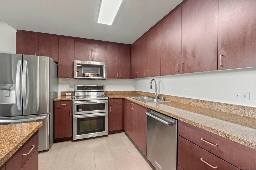 This is a beautiful two-bedroom, two-full bath residence located in East Village/Downtown San Diego. Kitchen features stainless steel appliances (refrigerator, stove/oven, dishwasher, in-unit washer dryer) , sleek countertops, and contemporary finishes. Amenities including a rooftop hot tub, on-site fitness cetner, and a rooftop lounge with BBQ grills perfect for relaxing or entertaining. There is also two assigned tandem parking spots in a gated underground parking lot connected to the building. Situated near premier dining, shopping, entertainment, and public transit. Walkable to main attractions such as Petco Park and Gaslamp District.
