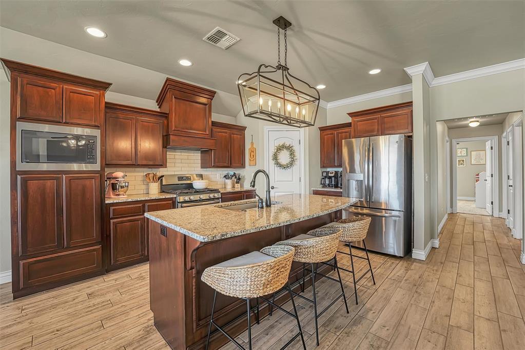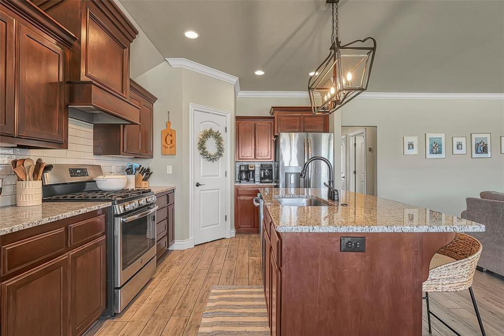 Home is available for rent $2500/month. Please contact Ashlee Jack with ReMax Property Place for more information. Nestled in a beautiful location,just north of Altus,this maintained 4-bedroom,2.5-bath home offers over 2,000 sq ft of open-concept. Step inside to find a welcoming entry way,soaring ceilings,tile flooring and an warm natural light in the common areas The kitchen features rich dark wood cabinetry,granite countertops,a large island,and seamless flow into the living and dining areas,great when entertaining. The split floor plan offers privacy and convenience,with the primary suite,extended laundry room,and half bath tucked away on one side,while three additional bedrooms and a full bath are located toward the front of the home.Enjoy the outdoors in the spacious backyard,complete with a covered and extended patio,a storage shed,and an extended driveway pad for extra parking. Additional features include a water filtration system at the sink and fridge line,and a storm shelter for peace of mind.