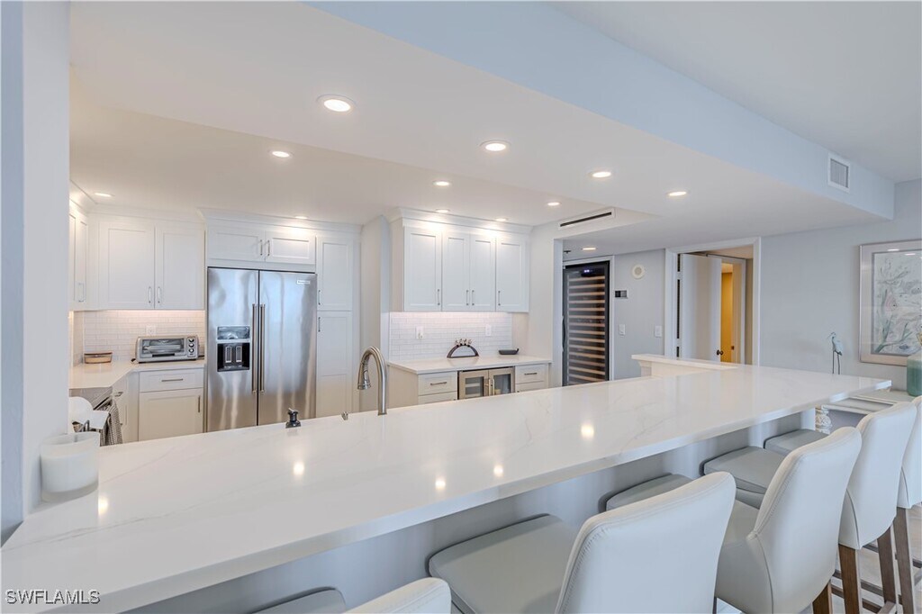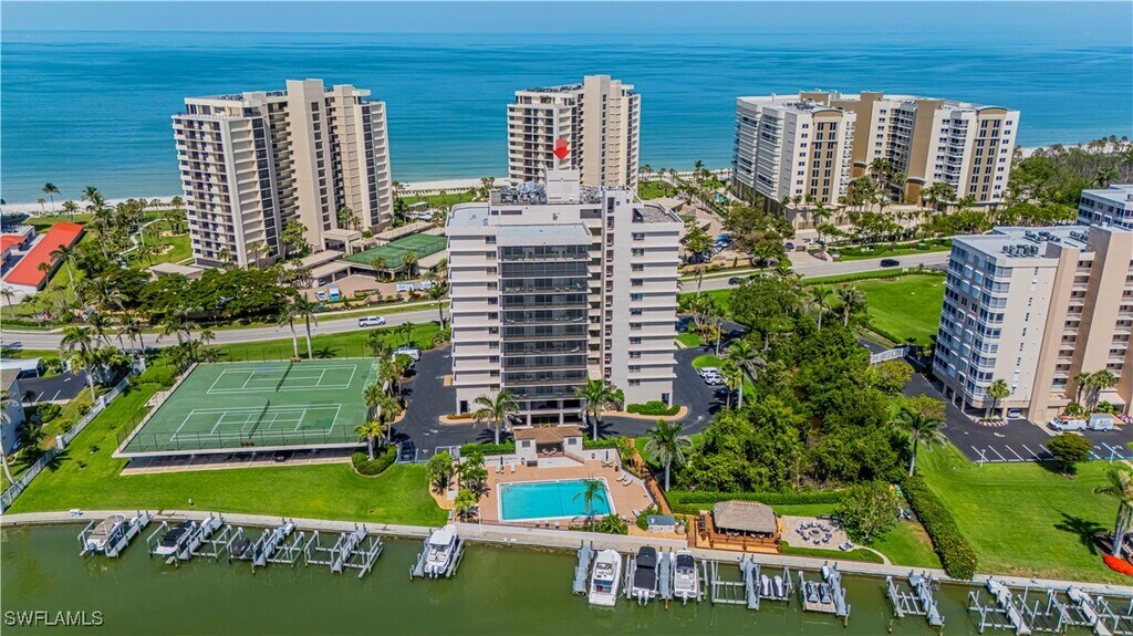 This beautifully renovated 2-bedroom,2-bath condo on the 9th floor offers sweeping views of the bay and Gulf from one of North Naples' most desirable locations,just steps from the beach. Whether you're seeking a seasonal retreat or a longer stay,this fully furnished residence combines coastal charm with modern luxury. The open-concept living space is flooded with natural light and features a fully remodeled kitchen with quartz countertops,white cabinetry,and a spacious breakfast bar perfect for entertaining. Enjoy sunrise bay views from your private screened-in balcony. Located in the exclusive,gated Vanderbilt Yacht & Racquet Club,residents have access to resort-style amenities,including a bayside pool with a Tiki hut,BBQ grills,tennis and pickleball courts,a fitness center,and private beach access just across the street. Two garage parking spaces are included,along with the option to lease boat docks offering easy Gulf access. Ideally situated near LaPlaya,The Turtle Club,and the vibrant dining and shopping at Mercato,this is beachside living at its finest. Turnkey furnished and move-in ready,this is a rare opportunity to experience Naples from a truly elevated coastal retreat. Available NOW until Dec,and April 2026 and beyond. Jan - March is rented!