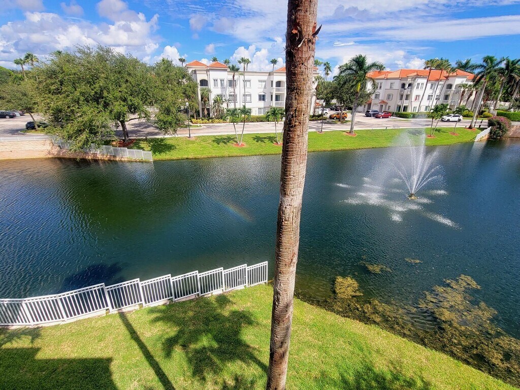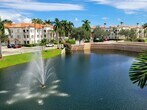 Best deal in Legacy Place! If having privacy and a garage are on your rental wish list, this condo is for you! LAKEFRONT, TOP FLOOR, CORNER condo with GARAGE, available beautifully Furnished, or Unfurnished. Prime location in the building with no neighbors above you. Sunny & airy open floorplan. Spacious kitchen with granite counters, stainless steel appliances, breakfast bar & built-in desk. Dining area surrounded by windows. Primary and guest bedrooms both have large walk-in closets. Full size washer & dryer inside the unit. Covered balcony with lake & fountain views. Very private, no other balconies nearby. 1-car garage, driveway & additional parking space. No elevator but just one flight up to front door, then an interior staircase to the unit.