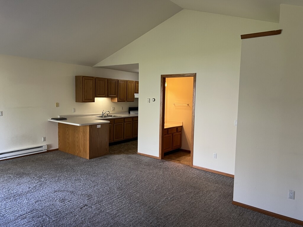 Ranch style duplex in Edgerton. 2 bedrooms, 2 bathrooms, with a 2-car attached garage. Kitchen includes fridge, range, dishwasher, garbage disposal, and stackable washer/dryer. Open floor plan living room, dining room, and kitchen with vaulted ceilings.