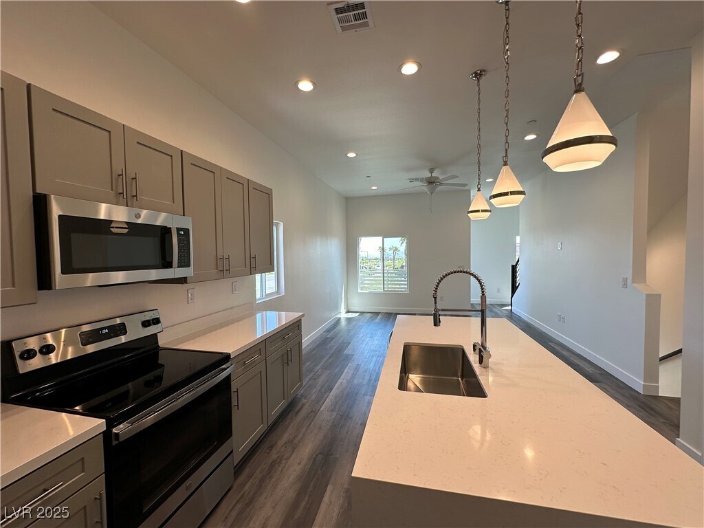 *Total Periodic Rent: $2,945.00 (Includes: $2,895.00 base rent + $50 Sewer & Trash). Welcome to this nearly new, impeccably maintained 4-bedroom, 5-bathroom townhome in a gated community in Summerlin. Built just one year ago, this spacious three-level home offers over 1,757 square feet of stylish living space. Each of the four bedrooms includes its own private en-suite bathroom, making it ideal for multi-generational living, roommates, or hosting guests in comfort and privacy. Enjoy sweeping views of the Red Rock Mountains and city lights from multiple levels. The home features an open-concept design, stainless steel appliances, all-electric energy-efficient systems, and a two-car attached garage. Located just minutes from outdoor adventures and urban conveniences, this gated community also offers a sparkling pool and ample guest parking. Modern, move-in ready, and thoughtfully designed—this townhome checks every box