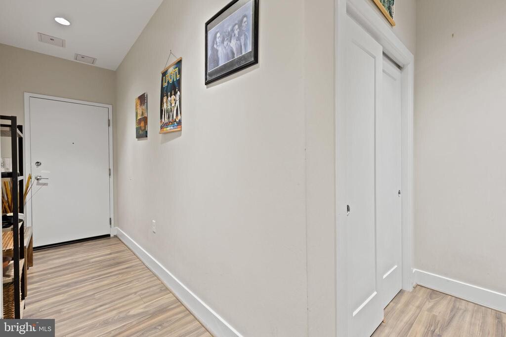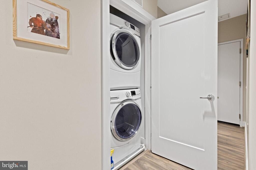Welcome to Residence #207 at The Corey! This contemporary 49-unit condo building is ideally located just steps from Union Market and the vibrant H Street Corridor. This chic 1-bedroom, 1-bath home exudes modern elegance with wood floors throughout and a chef’s kitchen outfitted with stainless steel appliances and a spacious peninsula. As you enter, a long hallway creates a home-like atmosphere, perfect for showcasing art or family photos. Thoughtfully placed nooks offer flexibility for a cozy library, a remote work setup, or even a compact home gym. The open-concept layout flows into a bright living space framed by expansive west-facing windows, ideal for natural light, indoor plants, or lazy sunbathing pets. Storage is plentiful, featuring four built-in shelves, two separate closets, and a dedicated laundry closet with a stacked washer and dryer. The Corey offers a suite of top-notch amenities: a rooftop deck with panoramic views of the Capitol and Washington Monument (perfect for 4th of July fireworks!), a barbecue area, fitness center, resident lounge, bike storage, secure ButterflyMX entry system, and elevator access. This end-unit gem is urban living at its finest—just moments away from some of D.C.'s best dining, cafes, and shopping. Sellers kindly request one hour's notice for showings.
