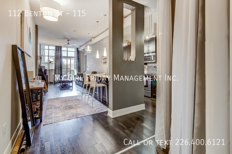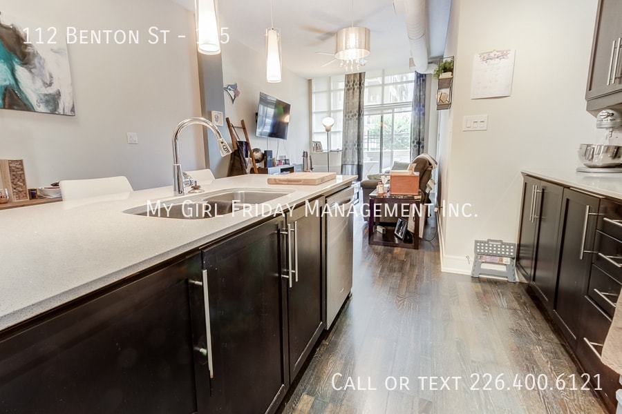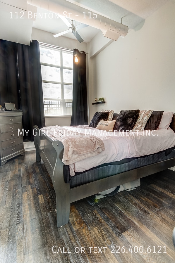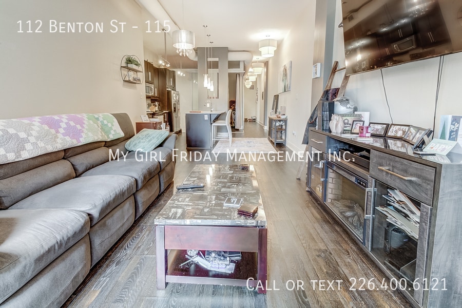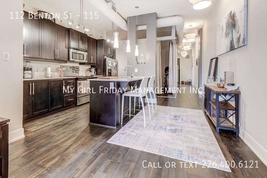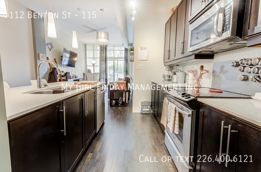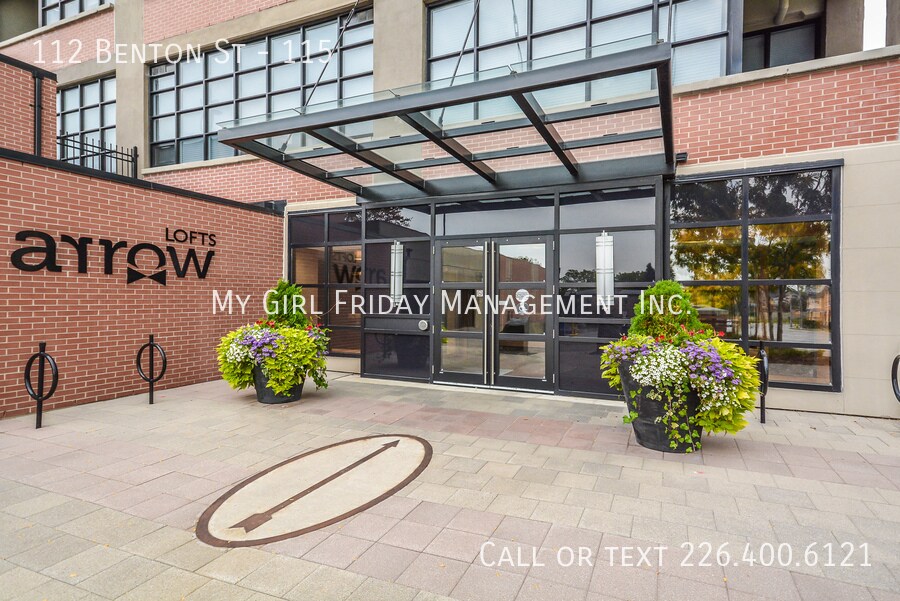 Discover stylish, sleek, and elegant living at Arrow Lofts — 112 Benton Street, Unit 115 — a new, classy two?bedroom, two?bath residence in the heart of downtown Kitchener. This upgraded suite features an open?concept living area with high ceilings, abundant natural light, and a lovely, quiet balcony perfect for morning coffee or evening relaxation. The gourmet kitchen is designed for both form and function, offering stainless steel appliances, a built?in microwave, dishwasher, double sinks, a striking tile backsplash and an island breakfast bar ideal for entertaining. The master bedroom includes a walk?in closet and a private ensuite bathroom, while the second bedroom is cleverly appointed with a built?in Murphy bed, large closet and custom shelving to maximize space and storage. One bathroom offers a tub/shower combo and the other a modern walk?in shower, and the entire condo features upgraded finishes throughout for a refined urban feel. Residents enjoy exceptional building amenities including a fully equipped gym, private boardrooms, a rooftop lounge and patio, and an in?building movie theatre. Steps from downtown's best restaurants, cafés, bars and craft breweries, and moments from Victoria Park, the Tannery District, Kitchener Market, THEMUSEUM and local arts venues, the location offers vibrant city living with easy transit access and proximity to the growing tech and innovation hub. Available 01/01/2026 for $2,400/month; one parking space is included and utilities are not. This building rarely has turnovers, so units like this move quickly — don't miss out.