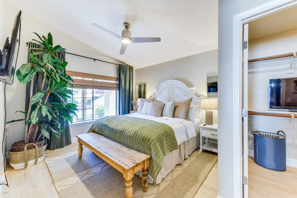 The advertised rate of $5,021/month is the lowest available price, based on a 30 day(s) stay with a move-in date of October 1, 2026. Rates vary depending on the duration of stay, season, and other parameters. For exact pricing and additional pricing components, please visit our website and enter your desired move-in and move-out dates. The rate is applicable when billed upfront; it can be higher if billed in multiple payments. Feel at home in this 2-bedroom, 2-bathroom Gilbert vacation rental, perfect for an extended trip in sunny Arizona. This property requires one step to enter. This newly remodeled apartment features 2 smart TVs with cable, board games, books, a dining table, ceiling fans, modern decor and furnishings, and walk-in closets. The kitchen is fully equipped with cooking basics, a blender, coffee maker, dishwasher, stove/oven, refrigerator, microwave, garbage disposal, ice maker, spices, toaster, and a water filter. You'll also find free Wi-Fi (100 Mbps), complimentary toiletries, linens and towels, an in-unit washer and dryer, central heating and air conditioning, a hair dryer, an iron/board, laundry detergent, trash bags, and paper towels. Covered parking is available for 2 vehicles, and visitor parking is also available. This is a pet-friendly property with a fee of $55. Enjoy the convenience of a small community shopping center. Downtown Phoenix is 23 miles away. Events, parties, or large gatherings are not allowed. Smoking is prohibited. [SI]