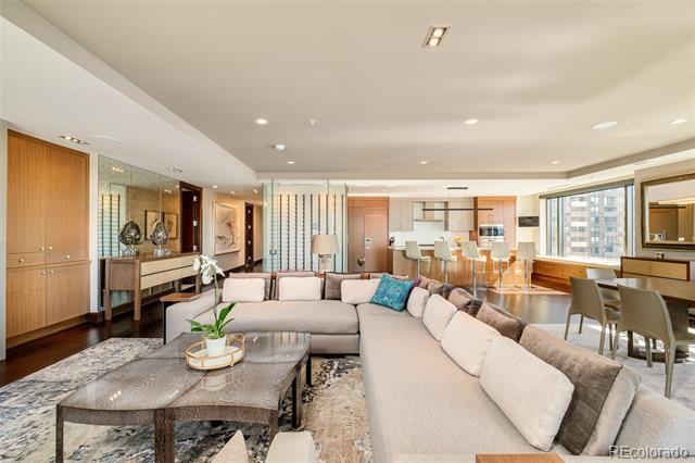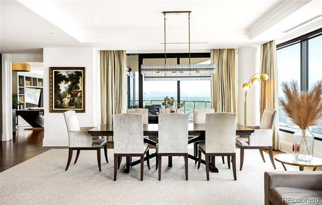 Immediately available for rent // Elevated high above downtown Denver, this fully furnished refined haven at the Four Seasons Private Residences offers an extraordinary fusion of luxury, comfort, and effortless urban living. Framed by sweeping Rocky Mountain views and bathed in natural light, this fully furnished luxury condo delivers a lifestyle defined by sophistication and convenience, with a Walk Score of 96 and world-class walkability to Denver’s best dining, the Denver Center for the Performing Arts, Ball Arena, and Union Station. Completely renovated in 2019 and 2020, the thoughtfully reimagined 2,531 sq ft layout flows seamlessly across generous living spaces, enhanced by custom design details, smart home automation, and exceptional craftsmanship throughout. The bespoke kitchen showcases custom cabinetry, integrated appliances, a temperature-controlled wine storage, and a discreet bar ideal for entertaining. A striking fireplace with a leather and steel surround anchors the living area, while expansive floor-to-ceiling windows frame stunning views of the Denver skyline and Rocky Mountains. Turnkey and fully furnished with high-end designer furnishings included, this lock-and-leave residence is a true private sanctuary above the city. Retreat onto the private southwest-facing balcony, or enjoy the world-class Four Seasons amenities — concierge service, spa, sauna, hot tub, fitness center, and pool. Two garage spaces included. This is elevated Denver luxury living at its finest. Condominium MLS# 2245520