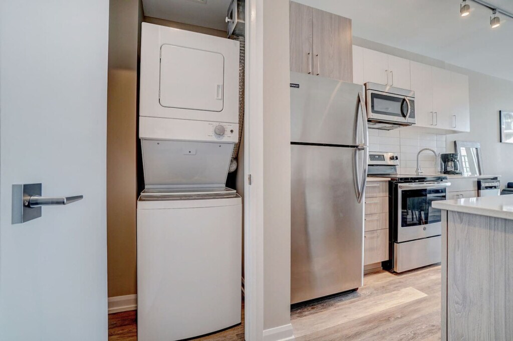 Experience luxury and comfort in Ottawa's trendiest neighborhoods, perfect for an exceptional stay. Professionally designed and fully equipped, this spacious unit is ideal for families, business travelers, or a romantic getaway. The apartment features two large bedrooms with queen beds, a private laundry room with a full-size washer and dryer, and a modern, fully stocked kitchen with high-end appliances. Relax on the rooftop terrace, enjoy the fitness center, or explore nearby shops and parks. Enter a bright, spacious living room designed as a tranquil escape. Elegantly furnished, the space features a cozy sofa, modern floor lamp, and a Smart TV, making it ideal for unwinding after exploring the city. The adjoining dining area, with soft lighting, seats four, creating a welcoming space for meals and gatherings. The kitchen is a dream for culinary enthusiasts, combining sleek design with practical functionality. Ample counter space and storage make meal preparation enjoyable, while high-end appliances cater to all cooking needs—from a quick breakfast to a gourmet dinner. Indoor parking is available up to availability with a fee and reservation is required. IPTV Box with more than 300 channels is available on request with a fee. Pets are welcome with a fee and some restrictions apply. Located in Hintonburg, a vibrant Ottawa community just 3 km from downtown, the apartment offers easy access to boutique shops, top dining spots, and Ottawa's best coffee and bakeries. Essential services like grocery stores, pharmacies, and banks are nearby, while the Ottawa Hospital Civic Campus is within walking distance, making it convenient for visiting professionals. The best way to explore Hintonburg is on foot, allowing you to immerse yourself in the neighborhood's vibrant atmosphere. The apartment is also close to scenic biking trails along the Ottawa River, perfect for cyclists. For venturing beyond Hintonburg, having a car can make it easier to explore Ottawa's wider attractions. Additionally, ride services like Uber are readily available, providing convenient options for getting around the city without the need for a personal vehicle. Smoking is prohibited to ensure a healthy and pleasant atmosphere for all guests. Guests will have full access to the entire apartment with complete privacy. Convenient elevator access is available throughout the building. We have a 24/7 guest support team available to assist you in any way we can. Reservations can be extended with 30 nights notice and are always subject to availability and rate variances. Ideal for business travelers, the apartment provides a perfect balance of work and leisure with high-speed Wi-Fi, a quiet atmosphere, and a comfortable workspace. A laptop computer is not included. [SI]