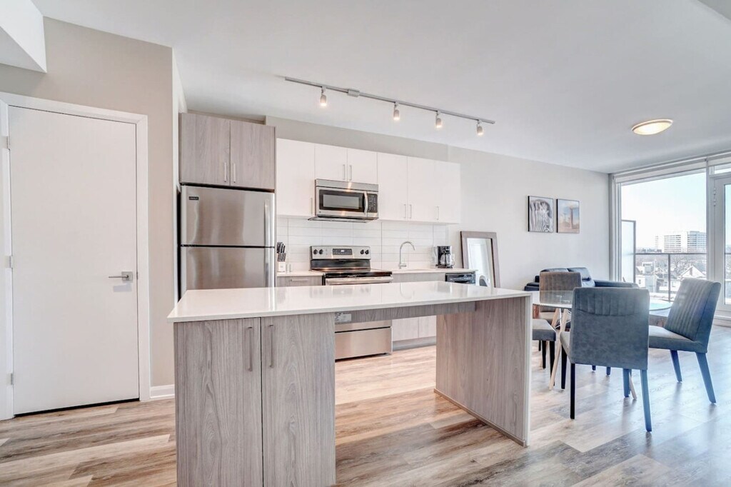 Experience the perfect blend of luxury and comfort in Ottawa's trendiest area with this stylishly designed, spacious apartment. Ideal for families, business travelers, and romantic getaways, this apartment features a spacious bedroom with a plush Queen bed, convenient in-unit laundry with a full-size washer and dryer, and a private balcony offering city views. The fully equipped modern kitchen with premium appliances and access to an on-site fitness center make this apartment a perfect urban retreat. Step into a spacious and bright living room designed to be your serene urban retreat. Elegantly furnished with a comfortable sofa, chic floor lamp, and a large Smart TV, this space is perfect for relaxation after a day of exploring Ottawa. The warm-lit dining area comfortably seats four, creating an inviting atmosphere for shared meals and conversations. The kitchen is a true chef’s delight, outfitted with modern design and expansive functionality, offering plenty of counter space, ample cabinetry, and high-end appliances that make cooking effortless. Convenient parking with EV chargers is available nearby, and indoor parking is offered up to availability with a fee, reservation required. IPTV Box with more than 300 channels is available on request with a fee. Pets are welcome with a fee, and some restrictions apply. Situated in vibrant Hintonburg, just 3 km from downtown Ottawa, this apartment provides the ideal base for families and tourists. Discover boutique shops, local eateries, parks, and some of the city's best coffee spots nearby. Proximity to The Ottawa Hospital Civic Campus also makes it a practical choice for visiting professionals. Hintonburg offers a unique mix of arts, culture, and dining, with attractions like the Hintonburg Community Association Art Gallery and trendy boutiques along Wellington Street. Outdoor enthusiasts can unwind at Remic Rapids Park, and the area’s dynamic vibe is highlighted by regular events like Hintonburg Happening. Guests will have full access to the entire apartment with complete privacy. The apartment is equipped with climate control, air conditioning, and heating for your comfort. Elevator access is available for easy mobility throughout the building. A 24/7 guest support team is available to assist with any needs during your stay. A Notice to Vacate must be sent in writing 30 nights before the departure date for stays over 30 nights, or a charge of 30 nights will apply. Reservations can be extended with 30 nights notice and are subject to availability and rate variances. Offering the perfect balance of convenience and luxury, this apartment caters to business travelers with high-speed Wi-Fi, a tranquil environment, and a well-appointed workspace. [SI]