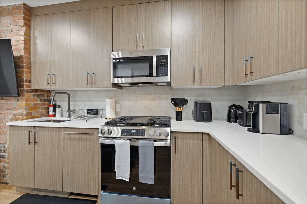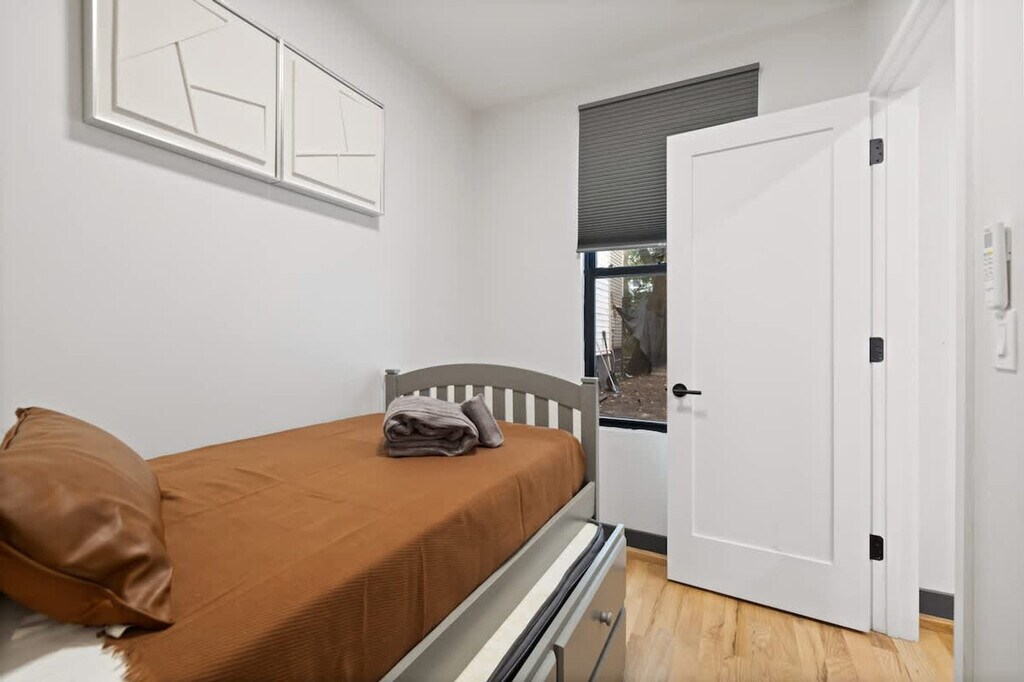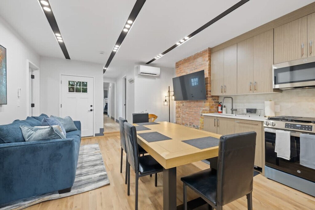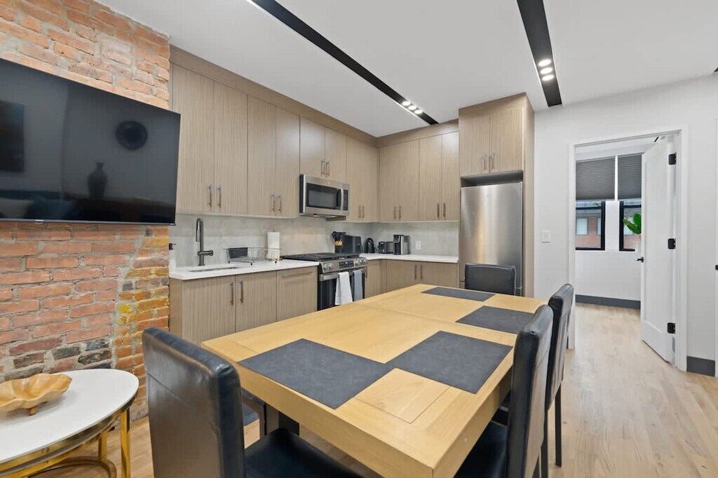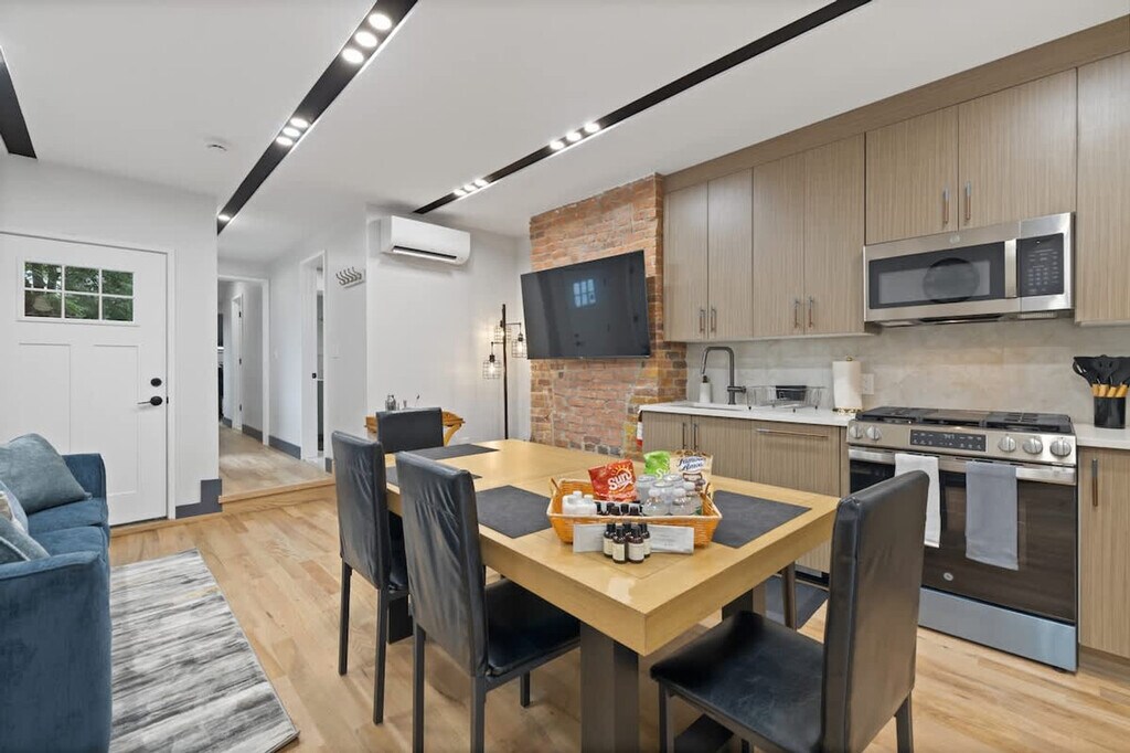 The advertised rate of $9,659/month is the lowest available price, based on a 30 day(s) stay with a move-in date of August 31, 2026. Rates vary depending on the duration of stay, season, and other parameters. For exact pricing and additional pricing components, please visit our website and enter your desired move-in and move-out dates. The rate is applicable when billed upfront; it can be higher if billed in multiple payments. Feel at home in this brand-new, stylish 3-bedroom apartment in Jersey City, just 15-20 minutes from NYC. Located on the first floor of a three-story building, this home comfortably accommodates up to 8 guests. This luxury apartment combines modern design with ultimate comfort. The spacious interiors feature warm, exposed brick. The modern, fully equipped kitchen includes a full suite of appliances, such as a stainless steel stove, oven, refrigerator, microwave, and dishwasher. The coffee station is ready for any preference with a drip coffee maker, an espresso machine, and a Keurig. For entertainment, there is a Smart TV and a PS5 gaming station. An in-unit washer and dryer are included for your convenience. A crib, pack 'n play, and high chair can be provided for those traveling with little ones. Discover the vibrant Heights neighborhood in Jersey City, a charming area perched atop the Palisades with breathtaking Manhattan skyline views. Central Avenue, the neighborhood's bustling heart, is a culinary paradise with diverse shops, cafes, and eateries offering everything from Italian pastries to Indian curries. Enjoy a short walk to Pershing Field Park, featuring baseball fields, a swimming pool, and an ice-skating rink. The PATH train is just a short trip away, providing direct access to Manhattan in approximately 20 minutes. You can also use NJ Transit buses to explore Jersey City and Hoboken. The area is very walkable, with shops, cafes, and parks nearby. Street parking is available. Some incidental noise from adjacent units may be audible. Check-in time is scheduled for 4:00 PM, and check-out time is 11:00 AM. Unauthorized late check-outs will incur a $200 fee. Street parking is available without charge, although availability is not guaranteed due to its first-come, first-served nature, and guests are responsible for adhering to street cleaning regulations to avoid citations or vehicle impoundment. Parties, gatherings, and smoking are strictly prohibited, with potential fines of up to $500. The dining table seats six, perfect for sharing meals or setting up your dedicated workspace. High-speed Wi-Fi is available throughout, making it easy to stream movies, work remotely, or connect with loved ones. [SI]