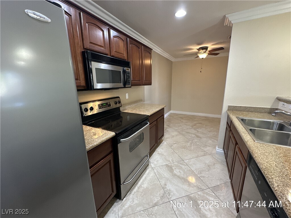FULLY UPGRADED Must see Summerlin Condo. This home features two spacious bedrooms complete with walk in closets, stainless steel appliances, crown moldings and baseboards throughout the property. This condo community has great amenities such as a community pool and private gated entrance. You don't want to miss this one!
