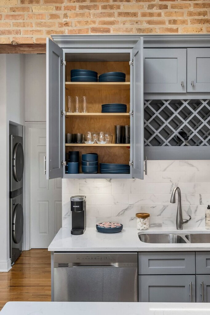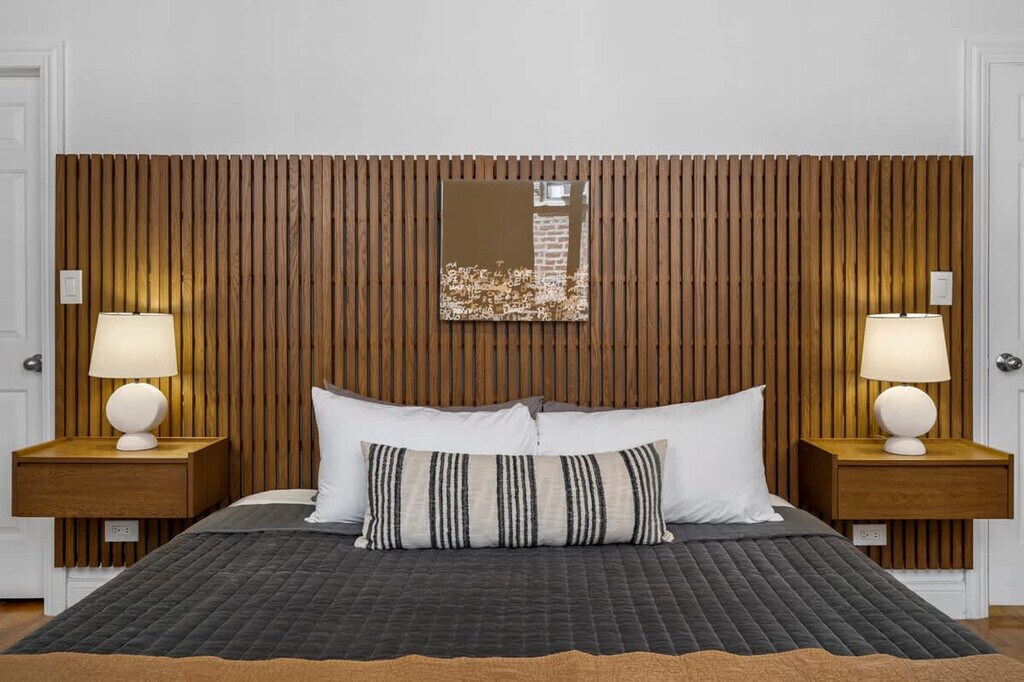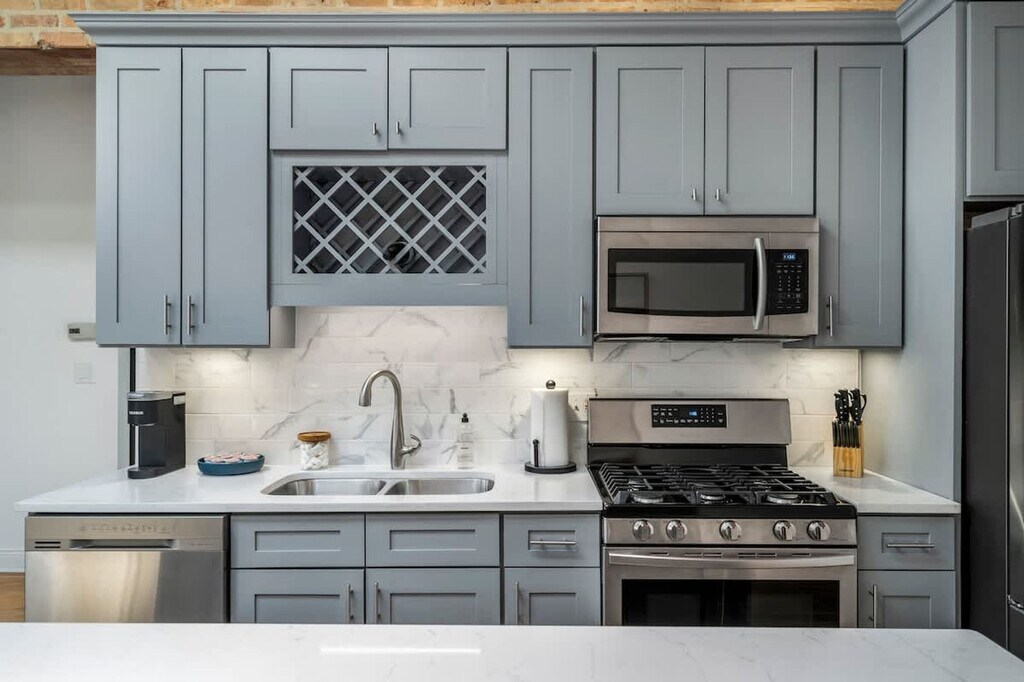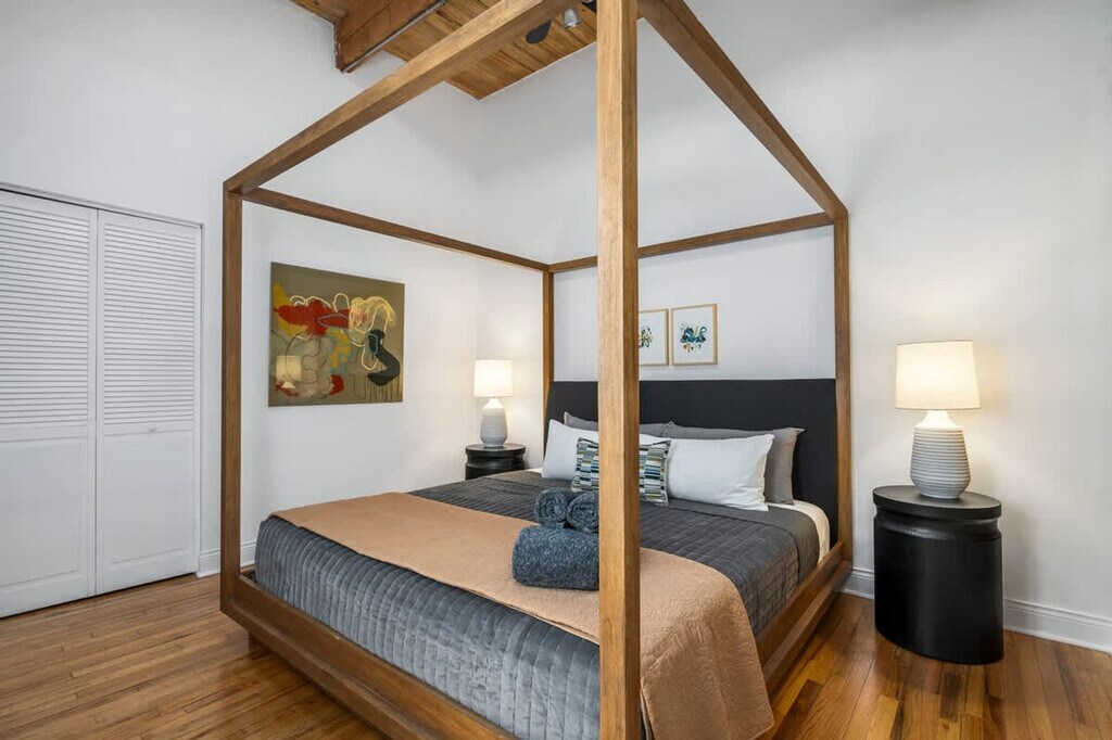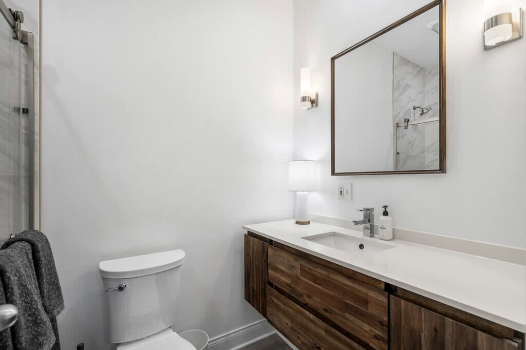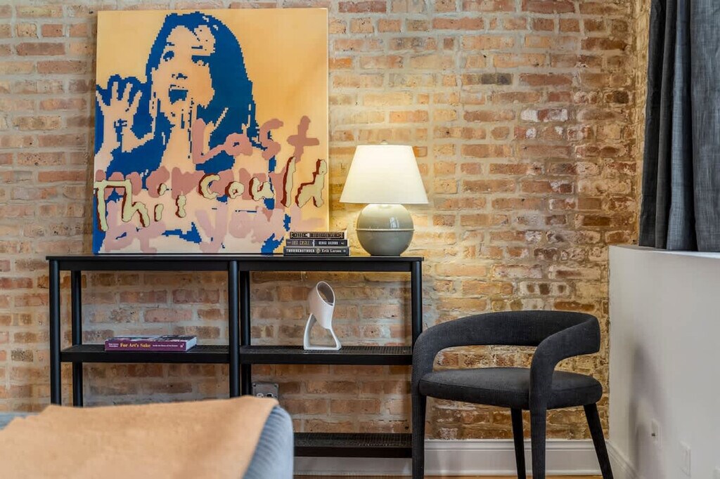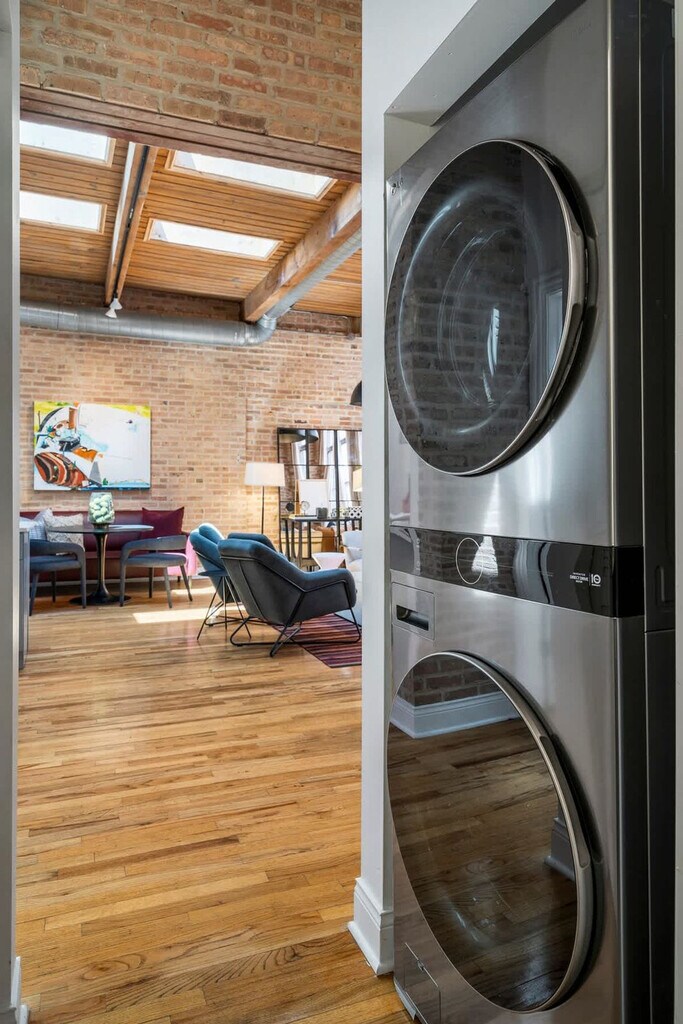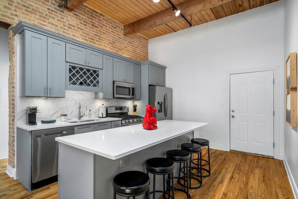 Feel at home in this beautifully remodeled 2-bedroom apartment in Chicago's iconic West Loop/Fulton Market neighborhood. This space is on the second floor, and you will need to climb one flight of stairs to access it. This private 2-bedroom, 1-bathroom apartment was artfully designed with a modern aesthetic combined with a few quirky details, creating a chic yet whimsical vibe. Inside, you'll find an in-unit laundry washer, dryer, iron, and board. The bright and airy living room features a 50" smart TV (no cable). The open-concept kitchen includes a quartz kitchen island, Carrera subway tile, and stainless appliances. Enjoy the high 12' ceilings and hardwood flooring throughout. Parking is not included; however, it is highly recommended to use SpotHero to reserve a spot nearby before you arrive. The building is situated near the Morgan Green/Pink line 'L' train stop. Countless trendy dining options, bars, shops, and more are just steps away. There is no smoking of any kind in the apartment, and there will be an automatic $500 cleaning fee if there is any smoke smell inside. Quiet hours are from 10 pm to 8 am. There is an automatic $100 late check-out charge if you're still in the property 20 minutes after check-out. USPS mail deliveries are not allowed during your stay. If you lose any items and request them to be returned, there is a $35 admin fee, and shipping costs are an additional charge. [SI]
