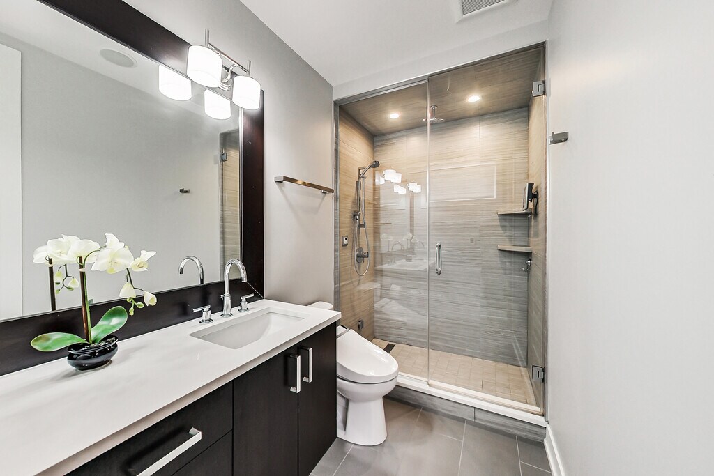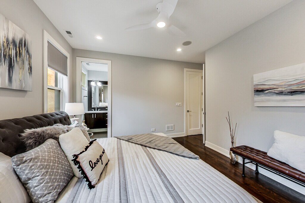 Spacious and modern 3-bedroom, 3-bathroom duplex down in the heart of West Town with private outdoor space and garage parking. This beautifully designed home features hardwood flooring throughout and a large open living and dining area, perfect for entertaining. Tall ceilings and a wall of windows fill the living room with natural light. The luxury kitchen is equipped with Bosch stainless steel appliances, quartz countertops with a breakfast bar, garbage disposal, custom backsplash, and abundant soft-close cabinetry. The lower level includes a spacious bedroom with a walk-in closet and a separate full bathroom. Upstairs, you'll find two additional bedrooms, including the impressive primary suite featuring two generous walk-in closets and a spa-inspired bathroom with double sinks and a steam shower. The third bedroom also includes a large closet and its own en-suite bathroom. Additional features include radiant heated flooring on the lower level and in the primary bathroom, an in-unit Whirlpool stacked washer and dryer, separate heating systems with individual controls, Wi-Fi thermostat, humidifier, surround sound wiring, and high-speed internet capabilities. Relax or entertain on the private garage rooftop deck with durable composite decking, perfect for grilling and enjoying summer evenings. Located in a highly convenient West Town location close to CTA bus routes 65 and 66, the Blue Line, and easy access to I-90/94, as well as neighborhood galleries, yoga studios, fitness centers, and a wide variety of dining options. Mandatory Resident Benefit Package: $40/month, which includes renters insurance, positive credit reporting for on-time rent payments, identity fraud protection, and additional resident services. Presented by Fulton Grace Realty, Chicago, IL.