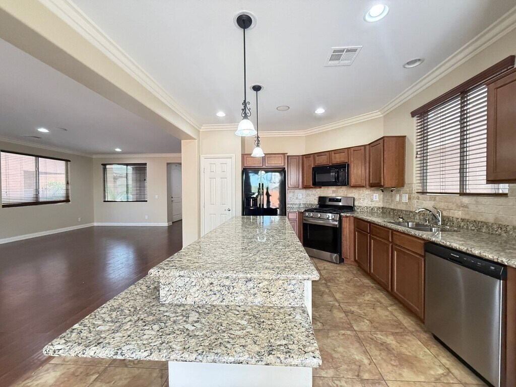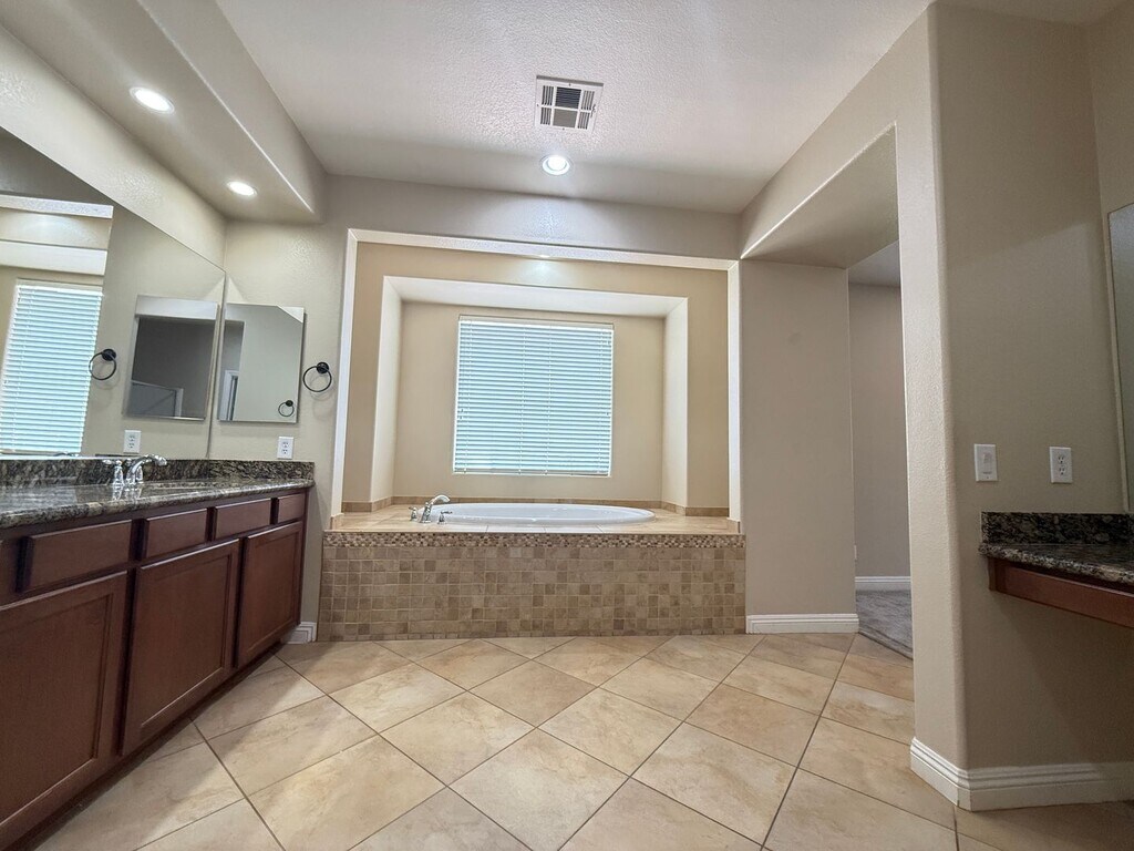 This spacious home in Rhodes Ranch features stunning mountain views and is situated in a beautiful 24-hour guard-gated golf course community. The neighborhood offers amazing resort-style amenities, including a water park with slides, a pool, tennis courts, exercise facilities, a clubhouse, and much more. Inside the home, you'll find an open floor plan with a large living room and a kitchen equipped with granite countertops, an island, and a pantry. The master bedroom is generously sized and includes a fabulous bathroom with dual sinks, a separate shower and tub, and a walk-in closet. All bedrooms are fitted with ceiling fans for added comfort. The beautiful backyard, complete with pavers, is perfect for family gatherings and entertaining. Small pets will be considered.