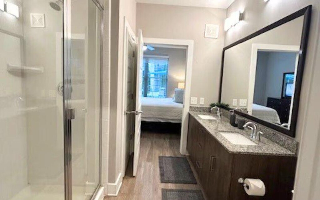 Feel at home in this luxury apartment located in the heart of Pill Hill in Sandy Springs, GA. This apartment features quartz kitchen countertops, a kitchen breakfast bar, energy-efficient stainless steel appliances, modern cabinetry with designer hardware and tile backsplash, undermount sinks with gooseneck faucets, smart thermostats, fiber internet, in-home full-size washer and dryer sets, wood-style flooring, built-in bookshelves, granite bathroom countertops, linen closets, deep-soaking garden-style bathtubs, walk-in glass-door showers, spacious walk-in closets, modern lighting, and living room and bedroom ceiling fans. Personal patios and balconies are also included. Amenities include a resort-style pool, gas grilling stations, a fitness center with Peloton® Bikes, and Fitness On Demand. You'll have direct access to some of Atlanta’s best shopping, dining, and entertainment options. The apartment offers walkability to MARTA Medical Center Station and major employers like Northside Hospital and CHOA’s Scottish Rite Hospital, making your everyday commute a breeze. [SI]