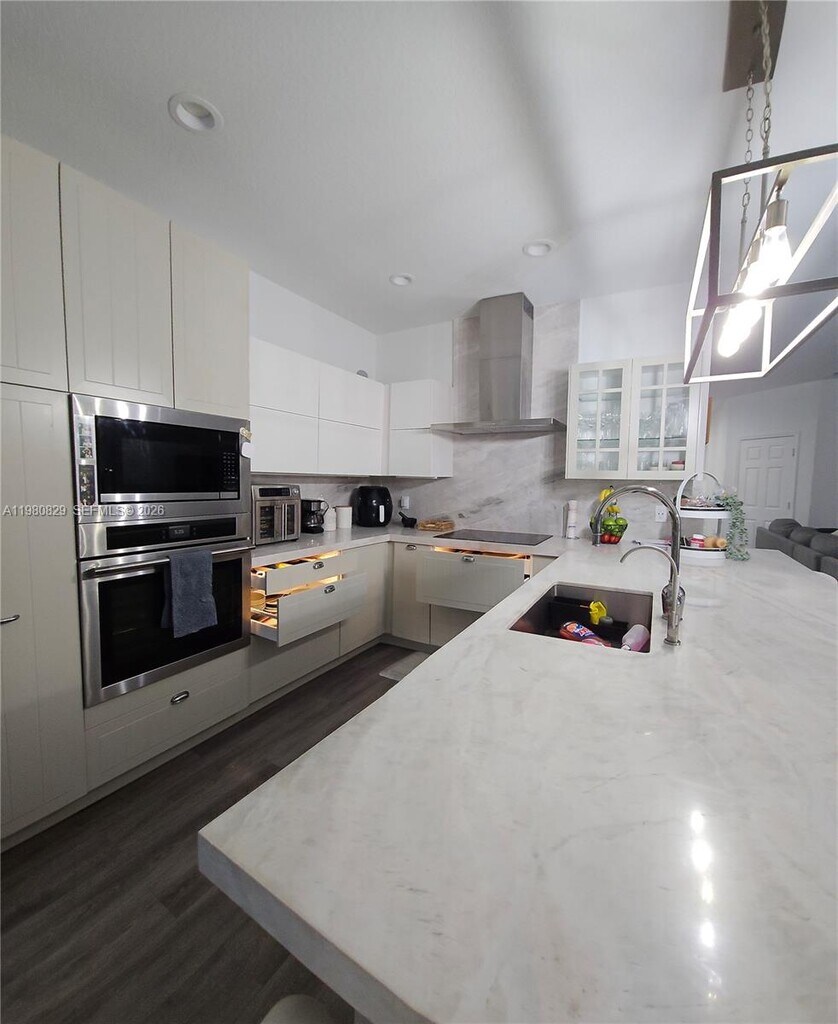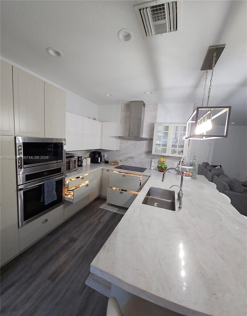 Unique & spacious townhome to fall in love with, where luxury, style & warmth meet in the heart of Doral. Fully remodeled corner 2-story in Saint Moritz @ Doral, redesigned to create a bright, open & expansive layout unlike others in the community. 4 bedrooms/ 2.5 bathrooms, all rooms counts with custom California-style closets. The primary suite offering two walk-in closets & a modern dual-sink bath. The huge kitchen is the centerpiece, showcasing an extended quartz island with seating for 6, luxury countertops, model-home style range hood, w/ abundant custom cabinetry with integrated LED lighting—perfect for cooking like a chef and entertaining. Spacious living, dining & amazing family room, include TV-ready setups, creating seamless comfort & functionality. The half bath features designer concrete-style wallpaper, a wood sink cabinet, and a modern illuminated mirror, all finished with impeccable taste. Include premium laminate flooring, elegant LED lighting, a high-end water filtration system for healthier living & security camera system for peace of mind. Enjoy a beautiful private patio with pergola, ideal for family gatherings and BBQs. Parking includes: 1-car garage, driveway for up to 3 vehicles + guest parking next to the home. Residents enjoy a community pool steps away & membership to Islands at Doral Club with resort-style amenities: Tennis courts, pool, gym, playground, Basketball, cabanas, classes & more. Prime location: A+ schools, shopping, dining & highways. MLS # A11980829