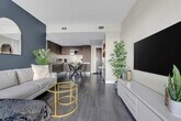 On the 9th floor of The Guardian, lies a luxury apartment that redefines urban sophistication. Feel at home with self check-in available anytime after 4 PM, two spacious bedrooms with two queen beds and a sofa bed, and two full bathrooms. Enjoy fast Wi-Fi at 500 Mbps, a 50” smart TV with Netflix, a fully equipped kitchen, and a private balcony with views of the Calgary Tower. The apartment also includes central AC and heating, in-suite washer and dryer, and access to a full fitness centre. The living room offers a comfortable queen-size sofa bed, a 50" smart TV with Netflix, and a modern and inviting mood. The kitchen is equipped with stainless steel and custom appliances, including a 4-burner stove, oven, microwave, refrigerator, freezer, and dishwasher with pods provided. Enjoy complimentary tea, coffee, water, and wine. The bar island dining area seats three or more. Bedrooms feature premium linens, pillows, spacious closets with hangers, nightstands, and reading lamps. The apartment also includes two full bathrooms, one with an ensuite full-size bathroom and the other with a walk-in shower. Optional upgrades include a National Park Entry Upgrade, Welcome Basket, Birthday Decor Package, Romantic Wine and Flower Package, Spa at Home Package, Movie Night Upgrade, Christmas Tree and Decor, Halloween Decor and Pumpkin Carving Package, Winter Cozy Package, Beer Tasting Kit, Diffuser and Aroma Set, Additional Bedding and Sleeping Arrangements, Grocery Pre-Stocking Service, and Pet Friendly Package. Two free underground gated parking stalls are provided, with additional paid parking available in the area. Located in the heart of Calgary, this apartment is transit-friendly with the Victoria Park/Stampede LRT Station steps away, offering quick access across the city. With a Walk Score of 97, everything you need is nearby, including Cowboys Casino, Stampede Grounds, BMO Centre, Saddledome, Calgary Tower, East Village, River Walk, Stephen Avenue, 17th Avenue, Calgary Zoo, Prince’s Island Park, TELUS Spark Science Centre, SAIT, University of Calgary, and Winsport. The area is bike-friendly with designated bike lanes and offers quick access to major highways, making road trips to Banff, Kananaskis, and Canmore a breeze. Smoking, vaping, or e-cigarettes are strictly prohibited on the property, with a $250 CAD fine for violations. Quiet hours are from 10 PM to 7 AM, and noise must be kept under 85db, as there is a noise detector. No parties, drugs, excessive drinking, or loud music are allowed. Events for work or meetings are permitted upon request. Unauthorized late check-out will result in an extra night stay or additional fees. The apartment is thoroughly inspected before arrival, and guests are responsible for any damages or issues caused during their stay. A $200 charge applies for unreturned Banff Pass or unit fob/key. Please remove outdoor shoes while in the home and exercise caution on the balcony, supervising children at all times. The apartment is remote work-friendly with fast Wi-Fi at 500 Mbps and a comfortable living area to accommodate your work-from-home needs.