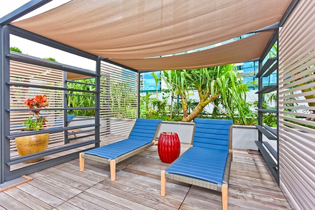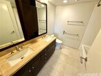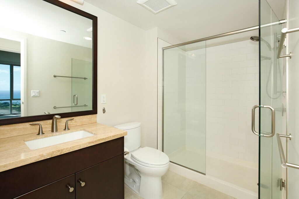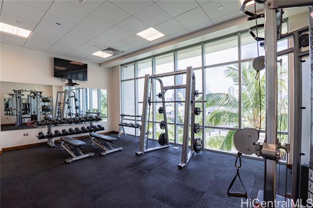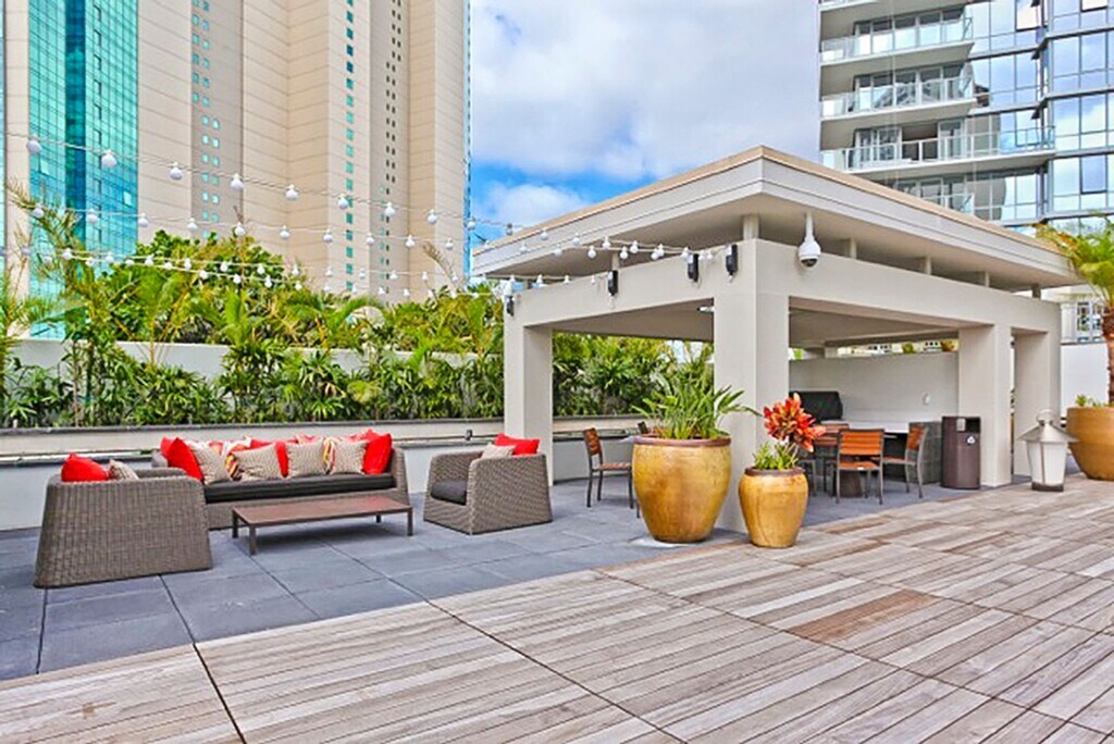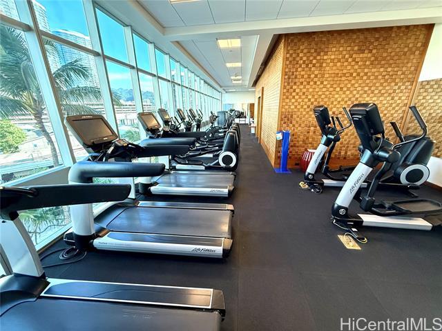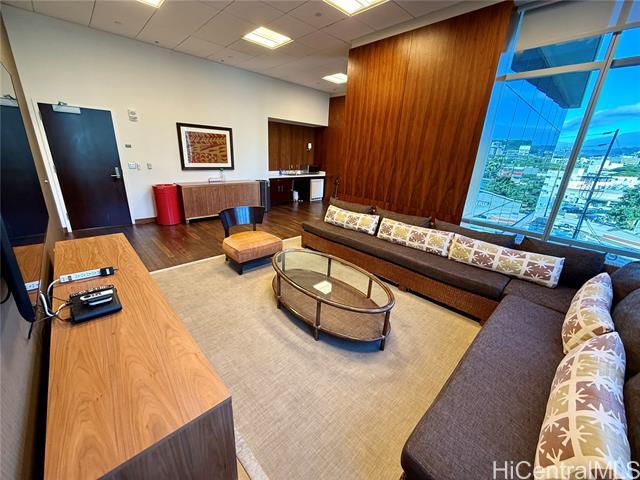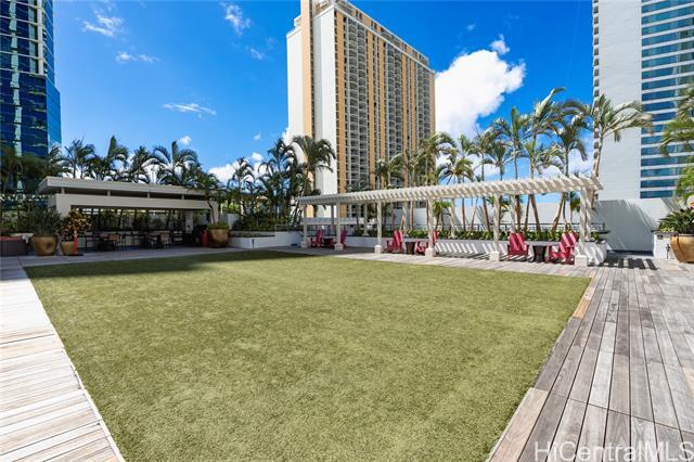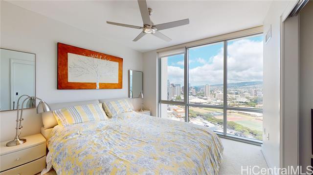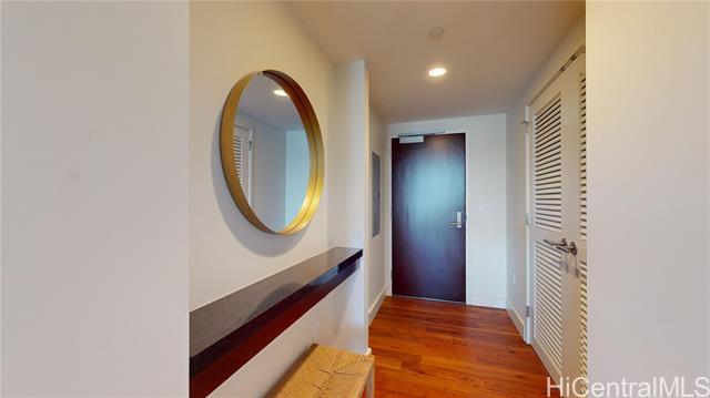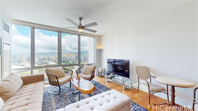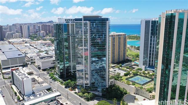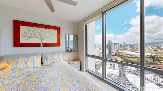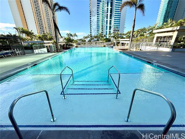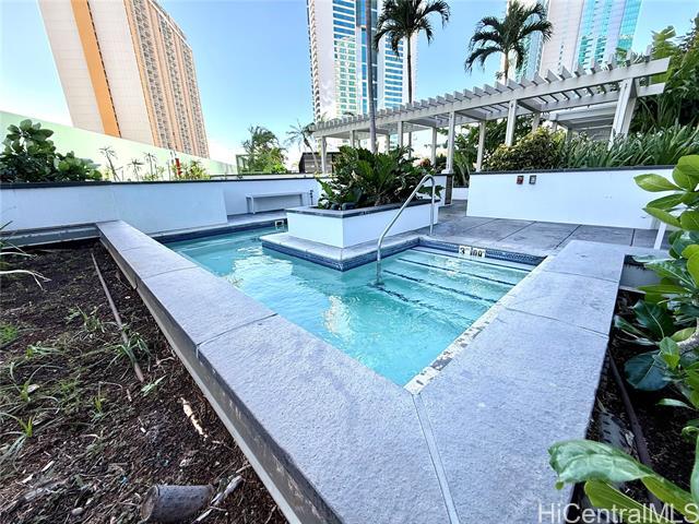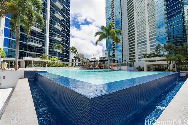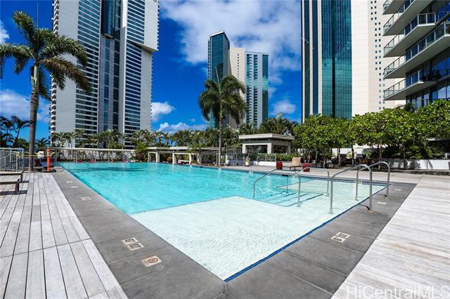This sleek and modern Waihonua unit is elegantly appointed with matte-finish walnut wood flooring, mahogany-stained cabinetry, stone countertops, Bosch kitchen appliances, and window shades. This secured building is conveniently located within walking distance of Ala Moana Shopping Center, Ala Moana Beach Park and Ward Village. Amenities include an infinity pool, spa, BBQ pavilions, club room with full kitchen, fitness center, resident's movie theater, two guest suites and surfboard and bike storage.