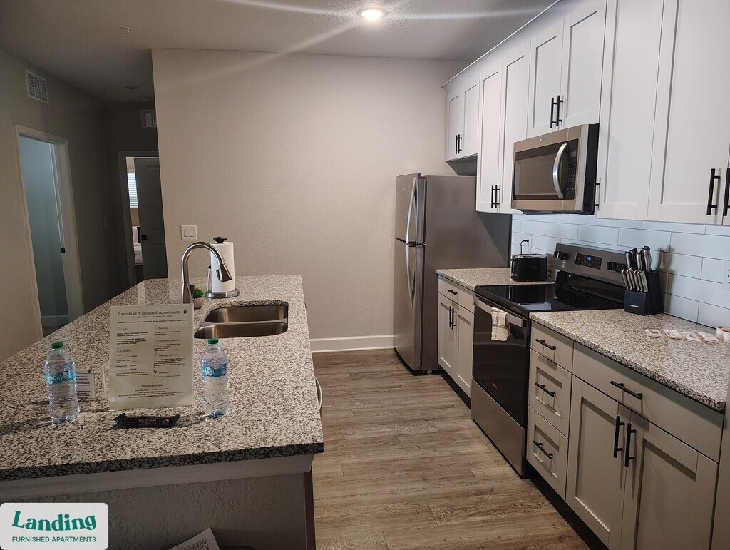 Landing offers flexible lease terms from weeks to months. Please always visit our website or contact us for the latest pricing & availability. Stay longer, save more: 6-Month Minimum base rent: starts at $2203/mo 12-Month Minimum base rent: starts at $2149/mo Landing offers flexible leases across a network of over 35,000 fully-furnished apartments throughout 375+ cities so you can rent on your terms, practically anywhere, and avoid the hassle of paying deposits or application fees. Visit to learn about all the benefits of a Landing membership, see our competitive up-to-date pricing, explore available apartments, take virtual tours, and make reservations online without jumping through traditional rental hoops. Landing's apartments at Vanguard are designed for comfortable, easy living, with the ability to stay as long as you like. Experience living with Landing Every apartment is outfitted with all the modern essentials including: custom-designed furnishings, a fully-equipped kitchen with deluxe stainless steel appliances, a gourmet coffee maker, premium linens, Smart TVs, and incredibly fast, reliable internet for working from home. When you live with Landing, you'll enjoy a hassle-free experience with the added benefit of 24/7 access to our dedicated member experience team. Some of the nitty-gritty: a background check and proof of income are required; we're completely smoke-free; bundled utility packages and pricing vary based on length of stay; pet-friendly options available; listed price reflects a 12-month minimum stay.