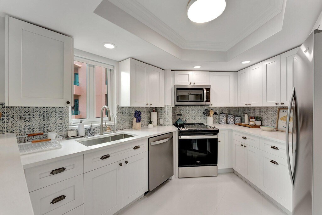 COMPLETELY RENOVATED LUXURY WITH INTERCOASTAL VIEWS! Modern decor with incredible thought given to details of this amazing oversized 1,785 square feet 2 bedroom and 2 baths condo. Large primary bedroom includes a Kind size bed, walk-in closet, a soaking tub, a shower, sink, all new appliances. Secondary bedroom has a Queen size bed and large closet. Hurricane Windows & Doors and 1 dedicated garage space. Indulge in Mizner Court's resort-style amenities including 2 Olympic-sized pools, 4 outdoor whirlpools, 2 tennis courts, 2 gyms (strength & cardio), party/card room, billiard/library room all set within this lush 13-acre gated property with 800' of waterfrontage on the Intracoastal, 24-boat slip marina, secure garage parking, abundant guest parking, 24-hour security.
