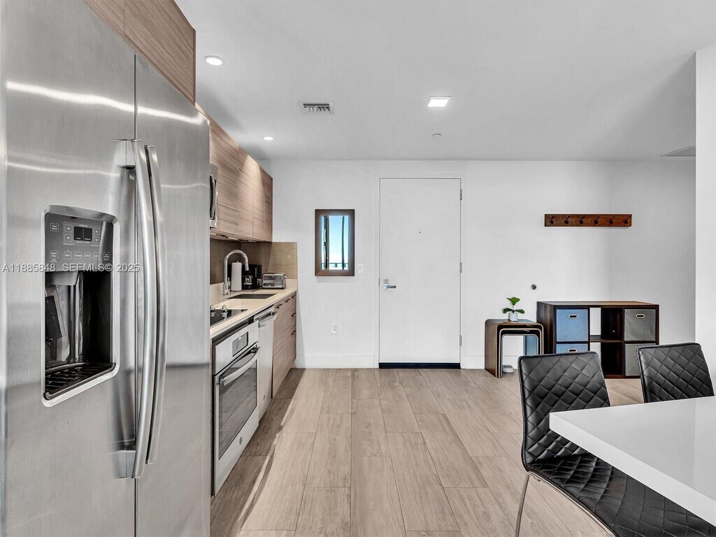 This 1 bdrm 1 bath plus DEN is rich with remarkable features. The efficient galley kitchen features ITALKRAFT cabinetry and GE appliances. Beautiful waterproof luxury vinyl plank flooring & custom window treatments provide a stately feel throughout. The neutral color palette of this GORGEOUS condo will accommodate any style of décor. The tranquil bedroom includes two walk-in closets & a private entrance into the bathroom. Enjoy a beautiful view of the Edgewater Skyline from the balcony. Hyde Midtown has 5-star amenities that truly make you feel like you are always on vacation. PRIME LOCATION steps away from the Shops & Restaurants of Midtown, minutes away from, Wynwood, Design District & much more.