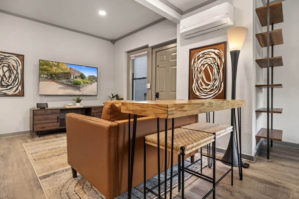 Step out of this beautiful, newly renovated studio apartment and find yourself steps away from everything! Located right on the Town Square, this apartment is on the 2nd floor of the building and guests must access it through a stairwell. This freshly remodeled studio features a memory foam king-size bed, a modern, fully equipped kitchen, a genuine leather sofa, a 65-inch TV, and a bar top with bar stools for enjoying your meals. Perfect for couples seeking a modern retreat or individuals looking to explore the heart of Fayetteville. Home to the University of Arkansas, amazing local restaurants and shops, and popular bike trails, Fayetteville does not disappoint. Whether you're visiting the University or exploring local eateries, there's something for everyone. Located less than a half mile from Dickson St. and the Fayetteville Town Square, public transit is nearby, and it's within walking distance to the University and all Downtown Fayetteville has to offer. This property is not pet-friendly, and pets discovered at the property will incur a fine of $400. The apartment is a non-smoking home, and smoking indoors will result in a $1,000 fine plus the cost of any necessary smoke remediation. A strict 2-person maximum is enforced, and there's no space to accommodate a third guest. Unauthorized parties or events will incur a $1,000 fine, and unauthorized checkout delays will incur a fine of $100 per hour. Quiet hours are between 22:00 and 10:00. Be courteous of other guests with noise late at night. Check-in is any time after 3:00 PM. Registration Number: STR- [SI]