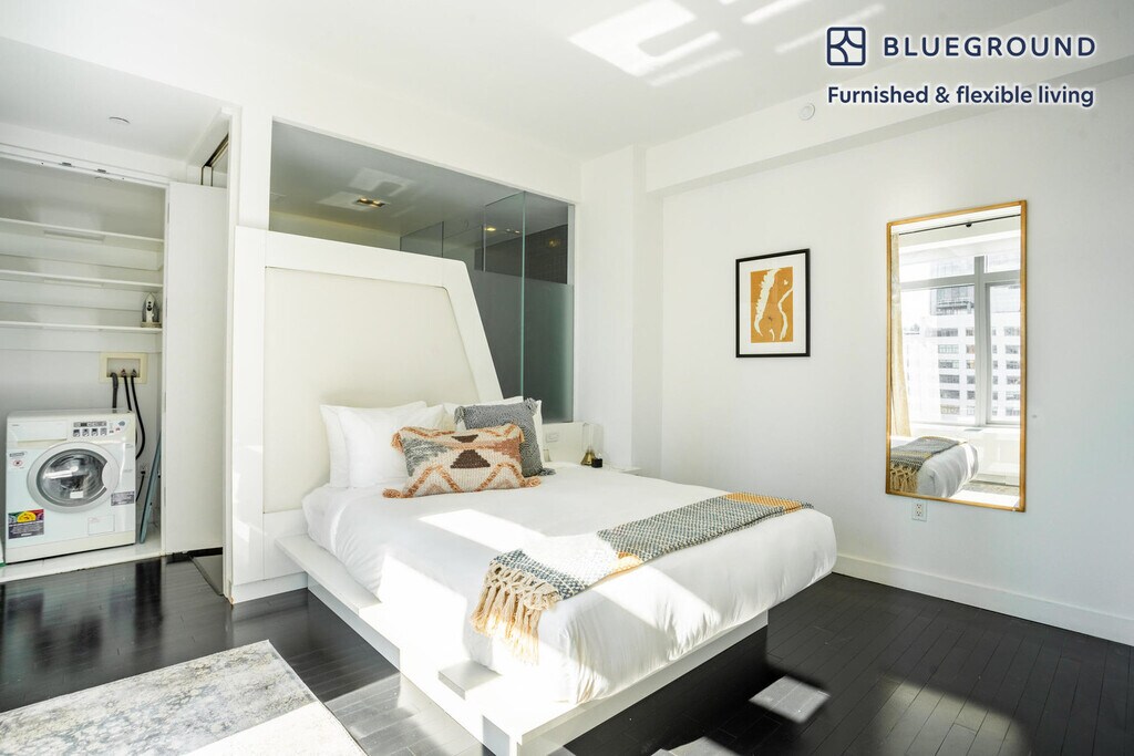 Show up and start living from day one in New York with this beautiful one bedroom Blueground apartment. You’ll love coming home to this thoughtfully furnished, beautifully designed, and fully equipped Financial District home with stunning high floor views over the city. (ID #NYC1376) The advertised rate of $5,910/month is the lowest available price, based on a 12 month(s) stay with a move-in date of June 6, 2026. Rates vary depending on the duration of stay, season, and other parameters. For exact pricing and additional pricing components, please visit our website and enter your desired move-in and move-out dates. The rate is applicable when billed upfront; it can be higher if billed in multiple payments. Brokers are welcome to reach out. Were you looking for an unfurnished lease? Try Blueground instead and upgrade from unfurnished to furnished living: - Furnished at rates comparable to unfurnished - No setup or furniture costs - save thousands - Move-in ready - save time, just bring your suitcase Designed with you in mind Gorgeous furniture, fully equipped kitchen, smart TV, and a premium wireless speaker are just a few of the amenities you’ll find inside this one bedroom apartment. Ideally located in New York, you’ll find a lot to love outside as well. When you’re ready to relax, you’ll be happy to discover every Blueground bedroom comes with superior quality mattresses, fully stocked linens, and cozy towels. We handle everything so you can simply show up and start living. This apartment also offers in-apartment laundry. Sleeping arrangements Queen Bed, 63in/160cm Amenities Building amenities unique to this one bedroom apartment include an on-site: - Doorman - Dryer - Elevator - Washing machine - Pets allowed Arrival and ongoing support The entire apartment is yours to enjoy! Throughout your stay, you’ll have access to our Client Experience team through the Blueground App. You can schedule additional cleanings, submit maintenance requests, and view our neighborhood recommendations with just a few taps. We’ll share all details upon confirmation of your stay. Ideally Located This furnished apartment is located in the Financial District, also known as FiDi. Home to Wall Street, One World Trade Center, the South Street Seaport, and Bowling Green it is a constant hub of activity. During the week the sidewalk is always bustling and the restaurants are filled with professionals. The glittering skyscrapers and well-known landmarks make this one of the city’s most recognizable and historic neighborhoods. By subway, Times Square is about 20 minutes away. Other things to note Building amenities may have an extra cost. This Blueground apartment has flexible lease options, allowing you to book it for one month, a year, or more. Pets are welcome, though weight limits and breed restrictions apply and may incur fees. Brokes CYOF. We take great pride in ensuring every photo displayed is shot in our own units with our actual furnishings. That said, we regularly refresh our decor and furniture arrangement, which may differ from what’s pictured. [SI]