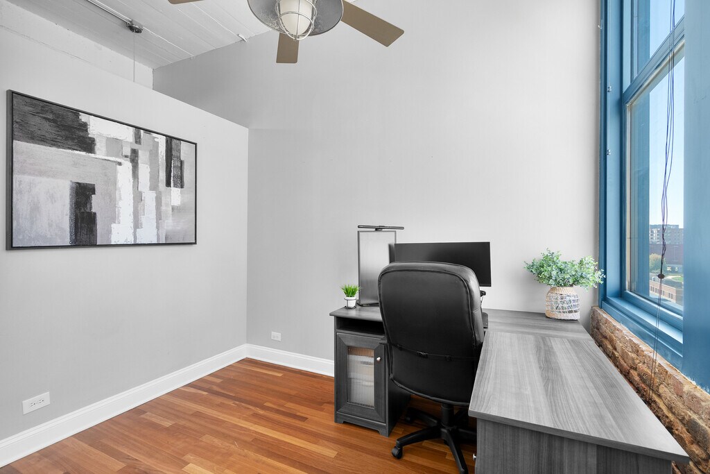 APS79529884 - Spacious, sun-drenched, and one-of-a-kind 1000+ square feet concrete loft in Printer's Row! It features 12-ft ceilings, an exposed brick wall, and oversized windows. The bright and open living room plus a separate dining or office area. The kitchen offers granite countertops, a breakfast bar, plenty of cabinet space, and stainless steel appliances including a dishwasher and a microwave. The bedroom includes two closets, one being a walk-in closet. Central air and heat. The building offers a spacious roof deck with outdoor furniture and a pergola, fitness room, laundry room, storage lockers, and bike storage. Parking options are available nearby, including a public parking garage next door and The Elle Apartment building across the street. This location is just steps away from the bustling Loop, museums, the theater district, Grant Park, Millennium Park, Roosevelt Collection shopping, and restaurants. Additionally, it provides easy access to expressways and public transportation, with the red, blue, brown, purple, and orange lines all just 3-5 minutes away. Immerse yourself in the vibrant urban lifestyle of Printer's Row with this extraordinary loft!