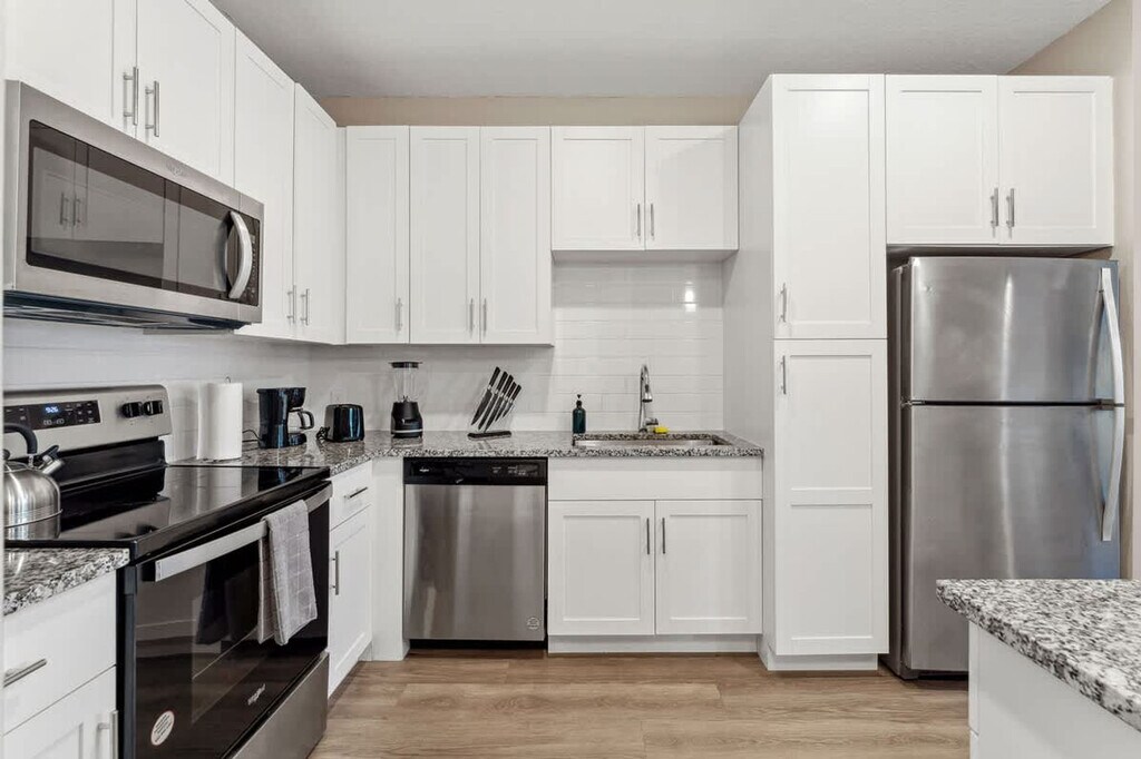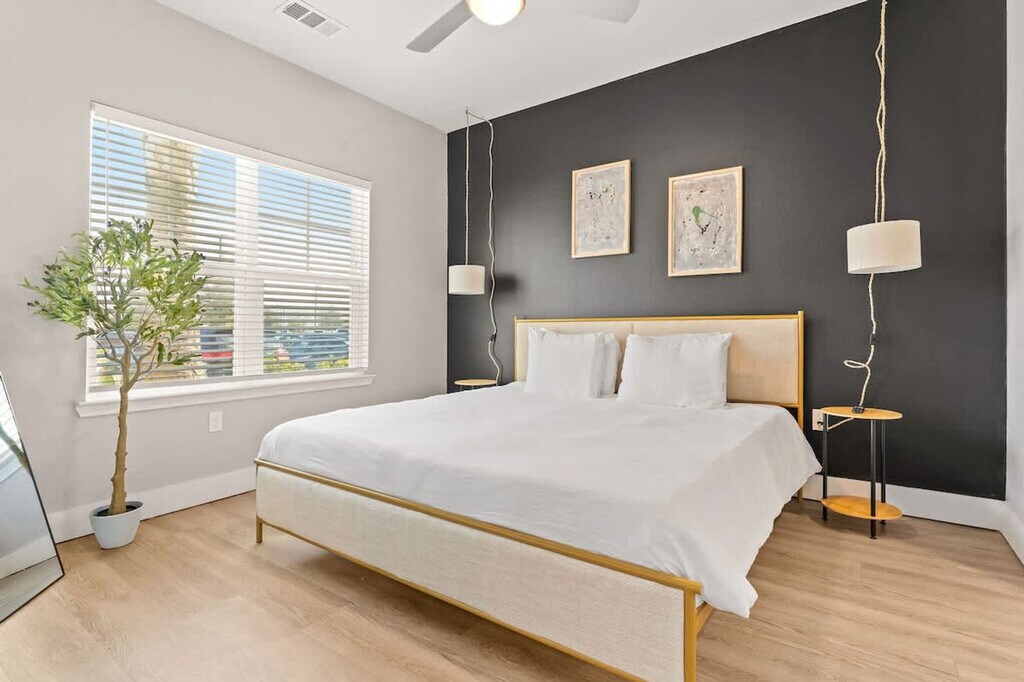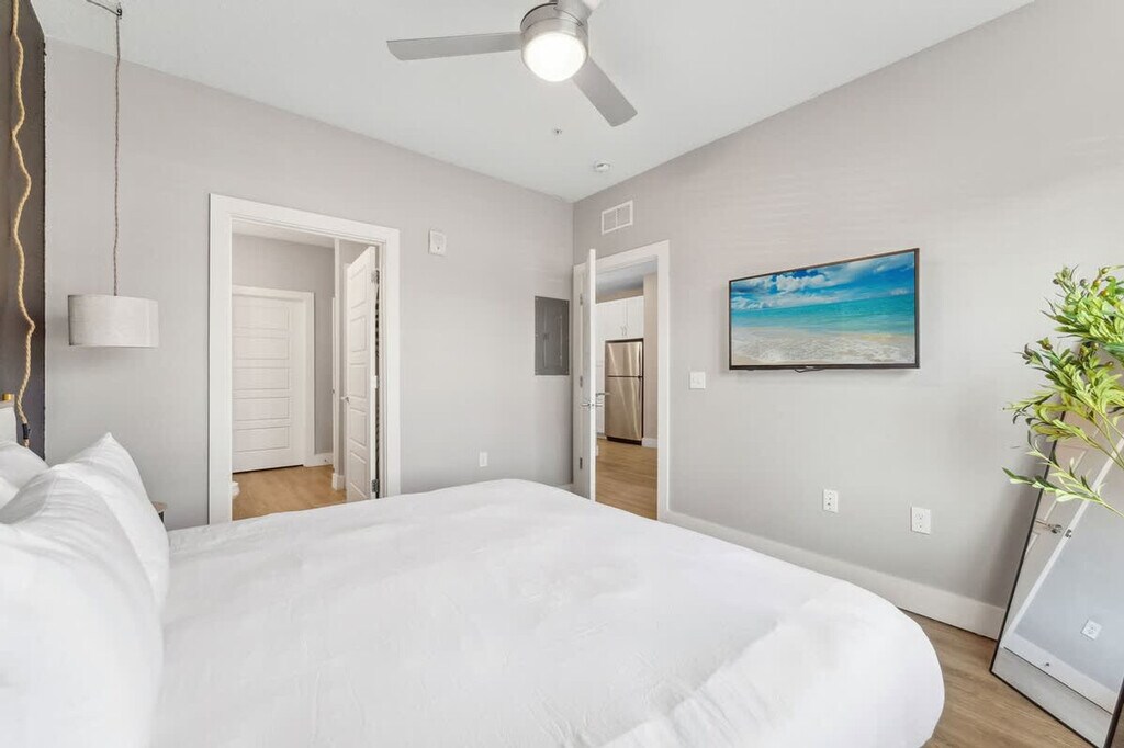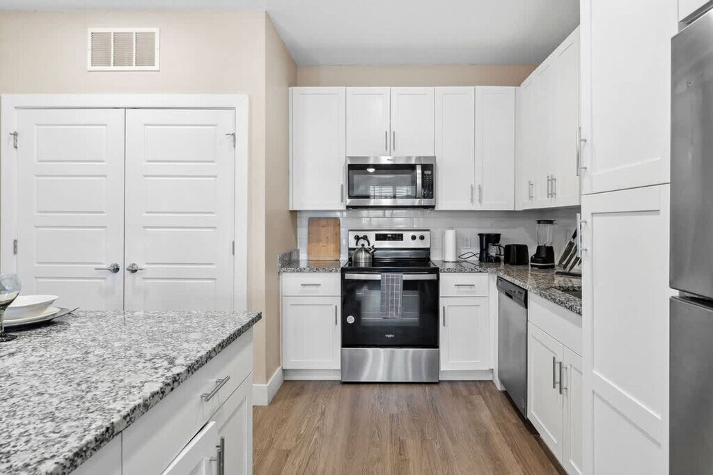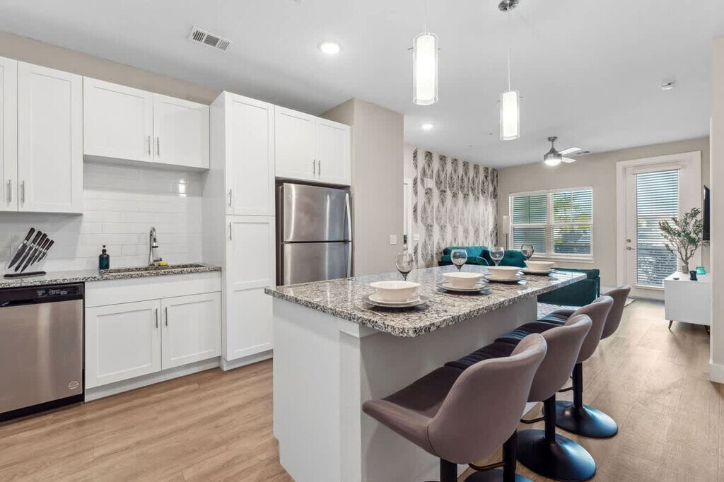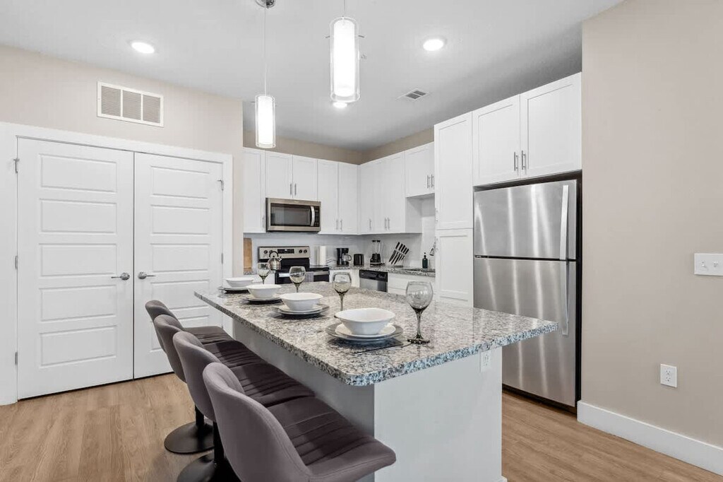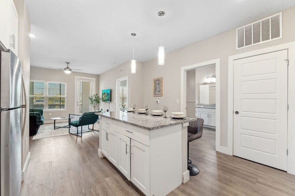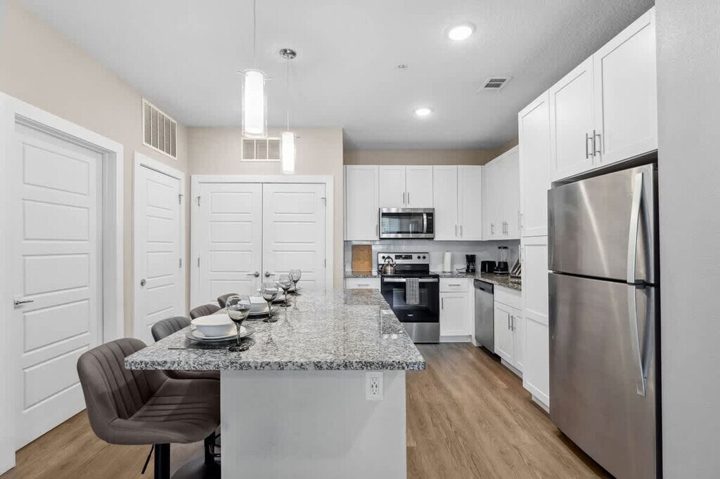 Feel at home in this modern 1-bedroom, 1-bathroom apartment in Orlando. This chic and cozy apartment offers the ideal base for your Florida adventure, combining comfort with convenience and featuring easy access to nearby theme parks, shopping, and dining options. The apartment features a bright and airy living space with ceiling fans in both the living room and bedroom, an open floor plan with upgraded flooring and stylish tile accents, and a screened-in patio. The fully equipped kitchen features energy-efficient stainless steel appliances, sleek granite countertops, a refrigerator, stove, microwave, coffee maker, blender, toaster, cookware, and utensils. The spacious bedroom offers a king-size bed with premium linens, a large walk-in closet with an iron and ironing board, a ceiling fan, and a 43” flat-screen TV. The full bathroom includes a spacious bathtub and essential amenities: toilet paper, shampoo, conditioner, shower gel, hand soap, towels, and hairdryer. Pets are welcome, but some breed restrictions apply: Pit Bull Terriers, Staffordshire Terriers, Rottweilers, Doberman Pinschers, Chows, Presa Canarios, Akitas, Alaskan Malamutes, and Wolf-Hybrids. A Pack 'n Play crib with a crib sheet and blanket (no pillow) is available. Enjoy the pool, stay active in the gym, or explore nearby attractions like Disney. This apartment is close to shopping, dining, and major Central Florida hotspots. Quiet hours are between 10:00 PM and 8:00 AM.