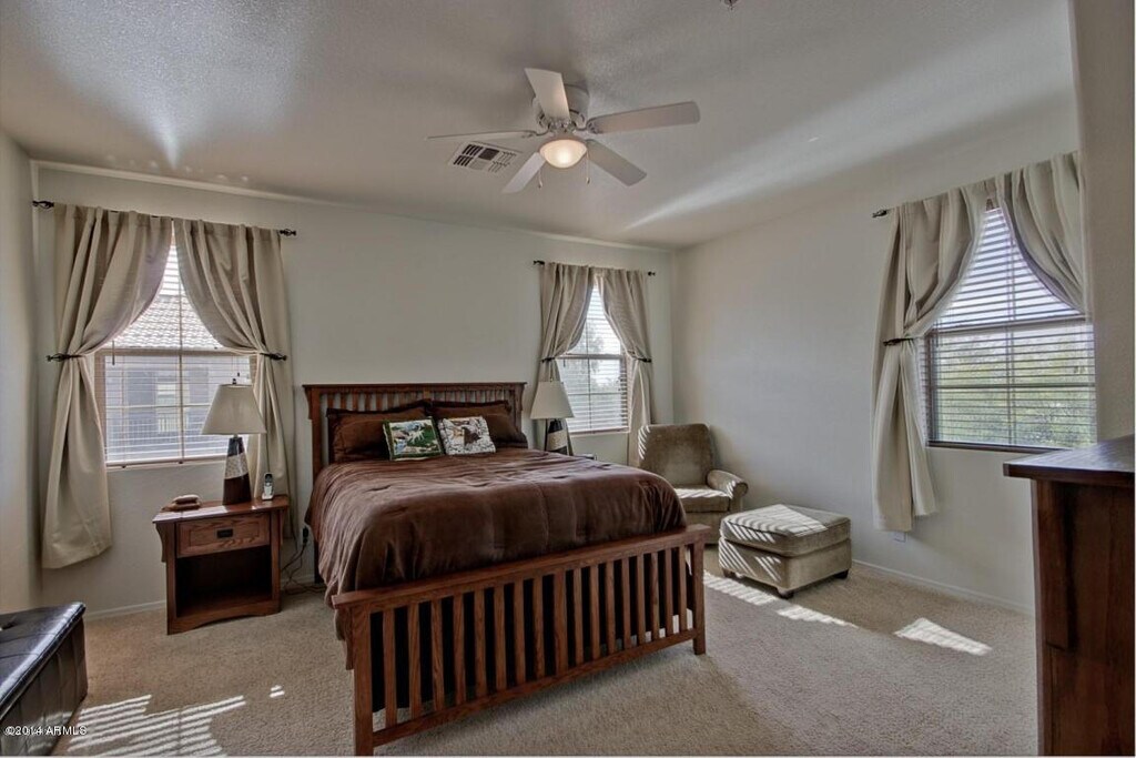 Available IMMEDIATELY; 2 Bedroom,2 Bath is FULLY FURNISHED; Natural Light attracts you to this beautiful townhome in much sought after Muirfield Village in Mesa; Basic Internet/Water/Electric and HOA Fee included; Walk-upstairs from the garage to the large great room,dining room and kitchen. Neutral tile in kitchen,carpet in bedrooms and lovely wood flooring throughout the rest of home. Kitchen has stainless steel appliances; walk-in-pantry,wood cabinets with planter shelves,with a beautiful long breakfast bar too. E-2 Windows; lovely Oak Railing. Both bedrooms have ceiling fans; Master bedroom includes a walk-in closet and a full bathroom with double sinks; Community Pool and Spa; All you need to bring is your clothes and your toothbrush. Won't last long.